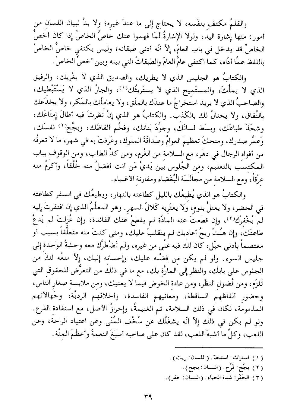 والكتاب هو الذي يطيعك بالليل كطاعته بالنهار، ويطيعك في السفر كطاعته في الحضر، ولا يعتلّ بنوم، ولا يعتريه كلال السهر. وهو المعلّم الذي إن افتقرت إليه لم يخفرك «3» ، وإن قطعت عنه المادّة لم يقطع عنك الفائدة، وإن عزلت لم يدع طاعتك، وإن هبّت ريح أعاديك لم ينقلب عليك، ومتى كنت منه متعلّقا بسبب أو معتصما بأدنى حبل، كان لك فيه غنى من غيره، ولم تضطرّك معه وحشة الوحدة إلى جليس السوء. ولو لم يكن من فضله عليك، وإحسانه إليك، إلّا منعه لك من الجلوس على بابك، والنظر إلى المارّة بك، مع ما في ذلك من التعرّض للحقوق التي تلزم، ومن فضول النظر، ومن عادة الخوض فيما لا يعنيك، ومن ملابسة صغار الناس، وحضور ألفاظهم الساقطة، ومعانيهم الفاسدة، وأخلاقهم الرديّة، وجهالاتهم المذمومة، لكان في ذلك السلامة، ثم الغنيمة، وإحراز الأصل، مع استفادة الفرع.