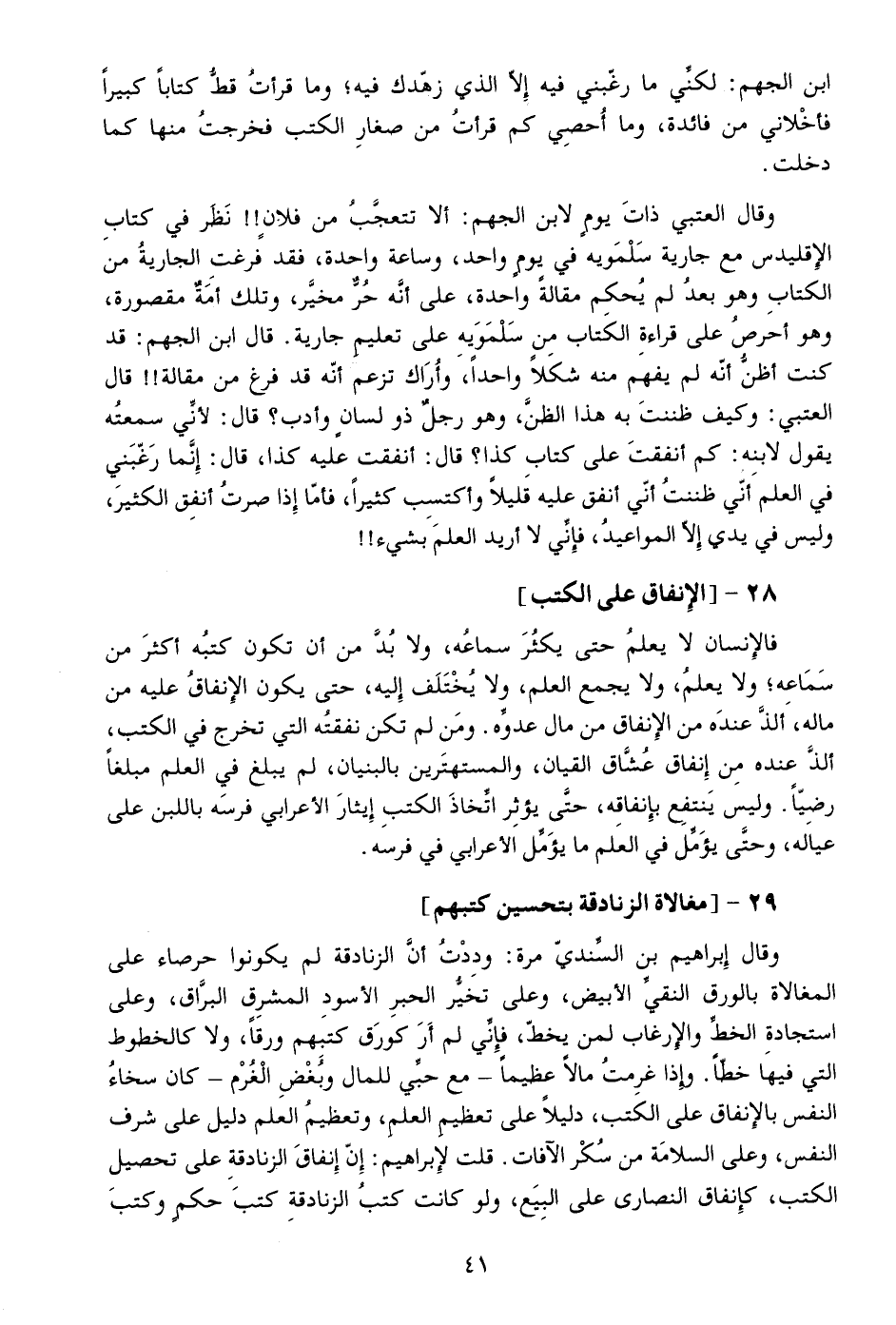 وقال إبراهيم بن السّنديّ مرة: وددت أنّ الزنادقة لم يكونوا حرصاء على المغالاة بالورق النقيّ الأبيض، وعلى تخيّر الحبر الأسود المشرق البرّاق، وعلى استجادة الخطّ والإرغاب لمن يخطّ، فإنّي لم أر كورق كتبهم ورقا، ولا كالخطوط التي فيها خطّا. وإذا غرمت مالا عظيما- مع حتّي للمال وبغض الغرم- كان سخاء النفس بالإنفاق على الكتب، دليلا على تعظيم العلم، وتعظيم العلم دليل على شرف النفس، وعلى السلامة من سكر الآفات. قلت لإبراهيم: إنّ إنفاق الزنادقة على تحصيل الكتب، كإنفاق النصارى على البيع، ولو كانت كتب الزنادقة كتب حكم وكتب