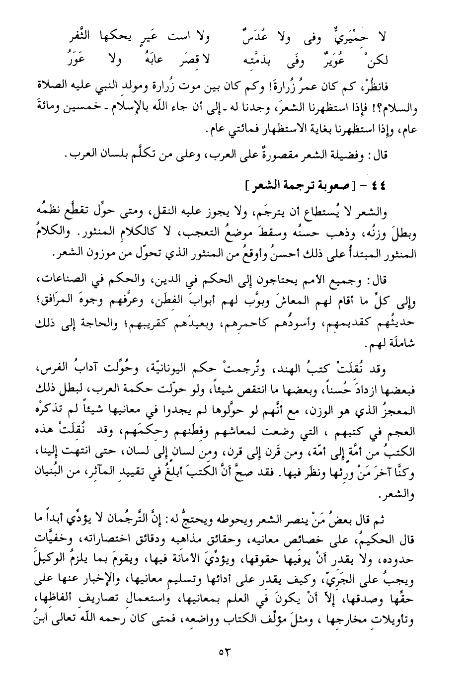 ثم قال بعض من ينصر الشعر ويحوطه ويحتجّ له: إنّ التّرجمان لا يؤدّي أبدا ما قال الحكيم، على خصائص معانيه، وحقائق مذاهبه ودقائق اختصاراته، وخفيّات حدوده، ولا يقدر أن يوفيها حقوقها، ويؤدّي الأمانة فيها، ويقوم بما يلزم الوكيل ويجب على الجريّ، وكيف يقدر على أدائها وتسليم معانيها، والإخبار عنها على حقّها وصدقها، إلّا أن يكون في العلم بمعانيها، واستعمال تصاريف ألفاظها، وتأويلات مخارجها، ومثل مؤلّف الكتاب وواضعه، فمتى كان رحمه الله تعالى ابن