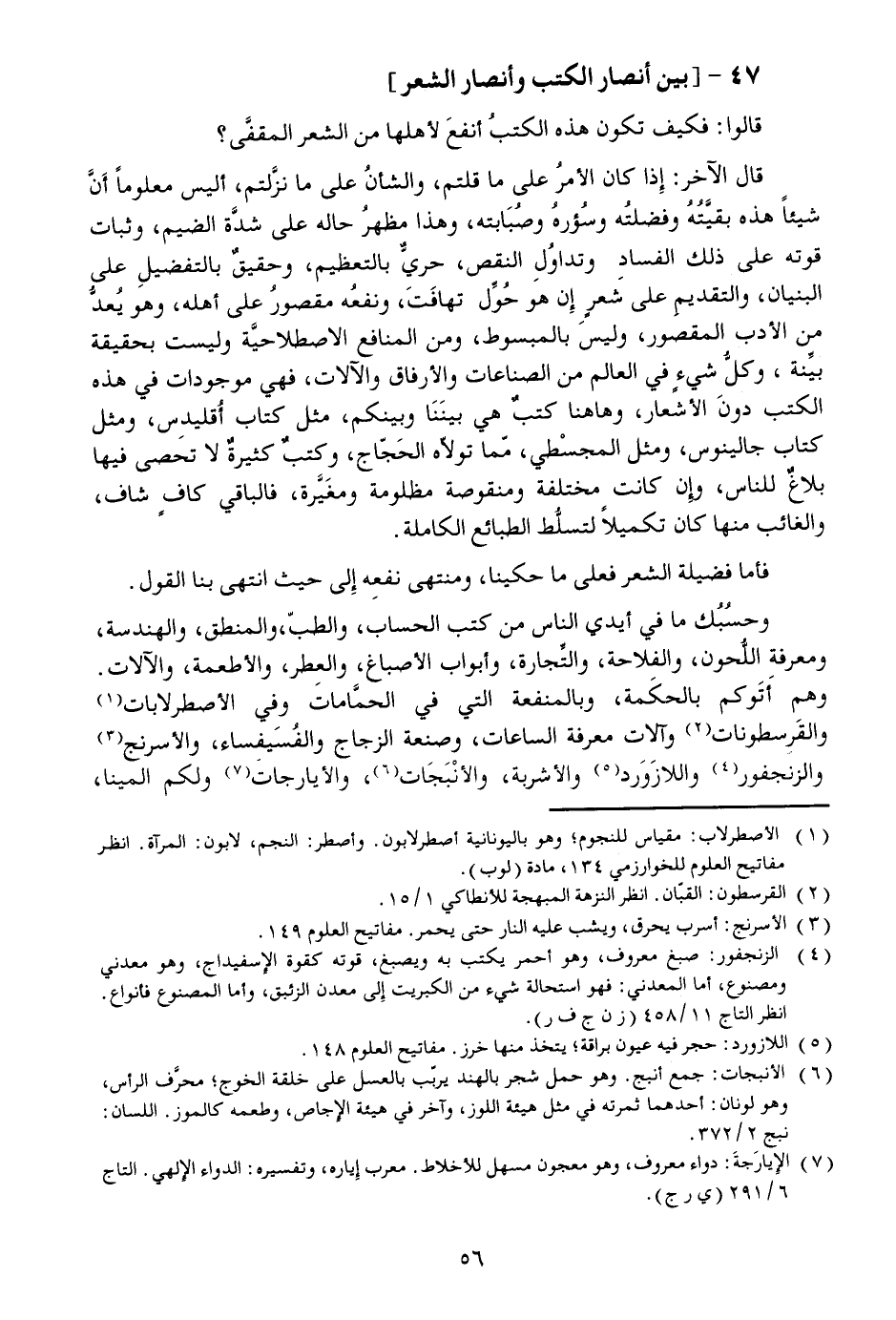 وحسبك ما في أيدي الناس من كتب الحساب، والطبّ، والمنطق، والهندسة، ومعرفة اللّحون، والفلاحة، والتّجارة، وأبواب الأصباغ، والعطر، والأطعمة، والآلات.