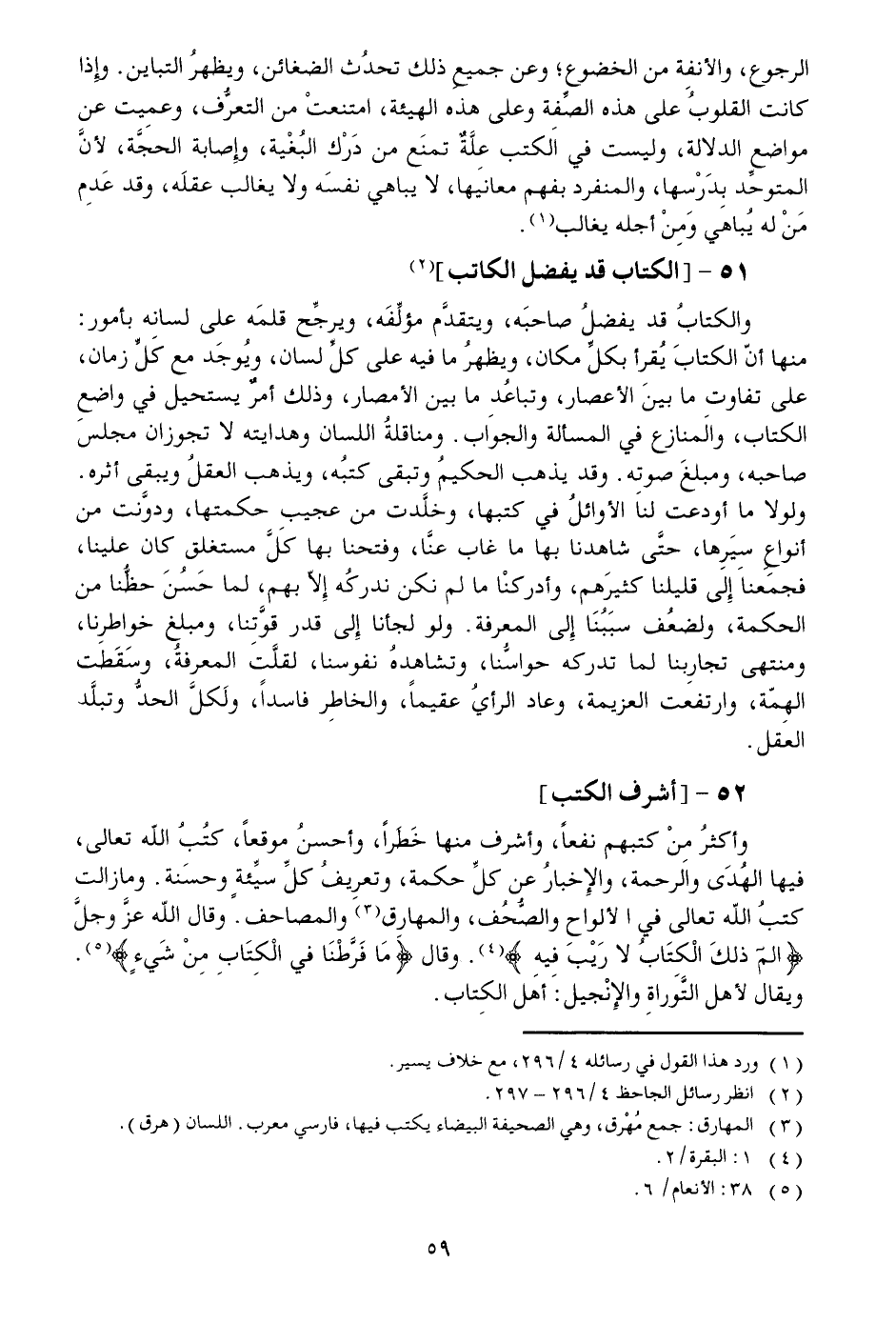منها أنّ الكتاب يقرأ بكلّ مكان، ويظهر ما فيه على كلّ لسان، ويوجد مع كلّ زمان، على تفاوت ما بين الأعصار، وتباعد ما بين الأمصار، وذلك أمر يستحيل في واضع الكتاب، والمنازع في المسألة والجواب. ومناقلة اللسان وهدايته لا تجوزان مجلس صاحبه، ومبلغ صوته. وقد يذهب الحكيم وتبقى كتبه، ويذهب العقل ويبقى أثره.