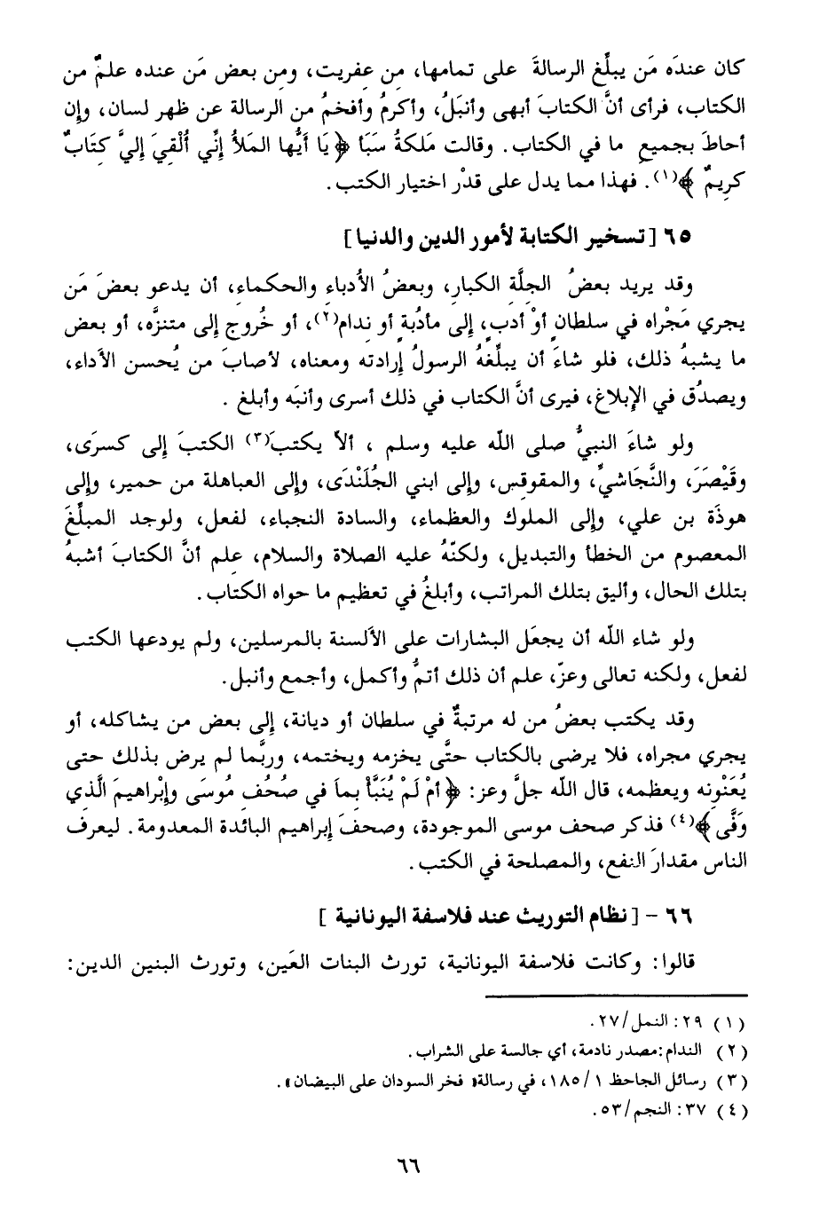 وقد يكتب بعض من له مرتبة في سلطان أو ديانة، إلى بعض من يشاكله، أو يجري مجراه، فلا يرضى بالكتاب حتّى يخزمه ويختمه، وربّما لم يرض بذلك حتى يعنونه ويعظمه، قال الله جلّ وعز: أَمْ لَمْ يُنَبَّأْ بِما فِي صُحُفِ مُوسى وَإِبْراهِيمَ الَّذِي وَفَّى