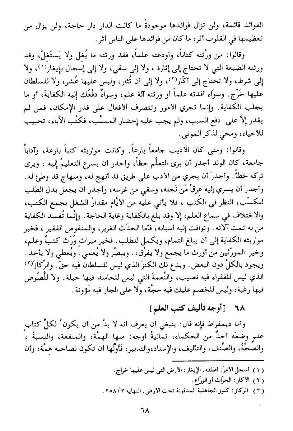 وأجدر أن يسري إليه عرق من نجله، وسقي من غرسه، وأجدر أن يجعل بدل الطلب للكسب، النظر في الكتب، فلا يأتي عليه من الأيّام مقدار الشغل بجمع الكتب، والاختلاف في سماع العلم، إلا وقد بلغ بالكفاية وغاية الحاجة. وإنّما تفسد الكفاية من له تمت آلاته. وتوافت إليه أسبابه، فأما الحدث الغرير، والمنقوص الفقير، فخير مواريثه الكفاية إلى أن يبلغ التمام، ويكمل للطلب. فخير ميراث ورّث كتب وعلم، وخير المورّثين من أورث ما يجمع ولا يفرّق،. ويبصّر ولا يعمي. ويعطي ولا يأخذ.