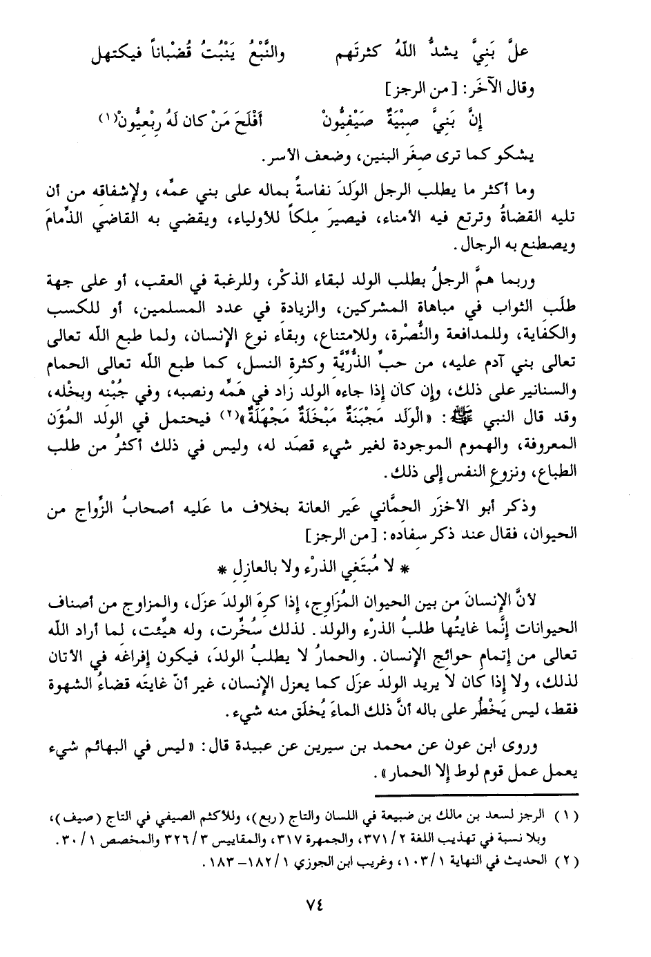 وما أكثر ما يطلب الرجل الولد نفاسة بماله على بني عمّه، ولإشفاقه من أن تليه القضاة وترتع فيه الأمناء، فيصير ملكا للأولياء، ويقضي به القاضي الذّمام ويصطنع به الرجال.