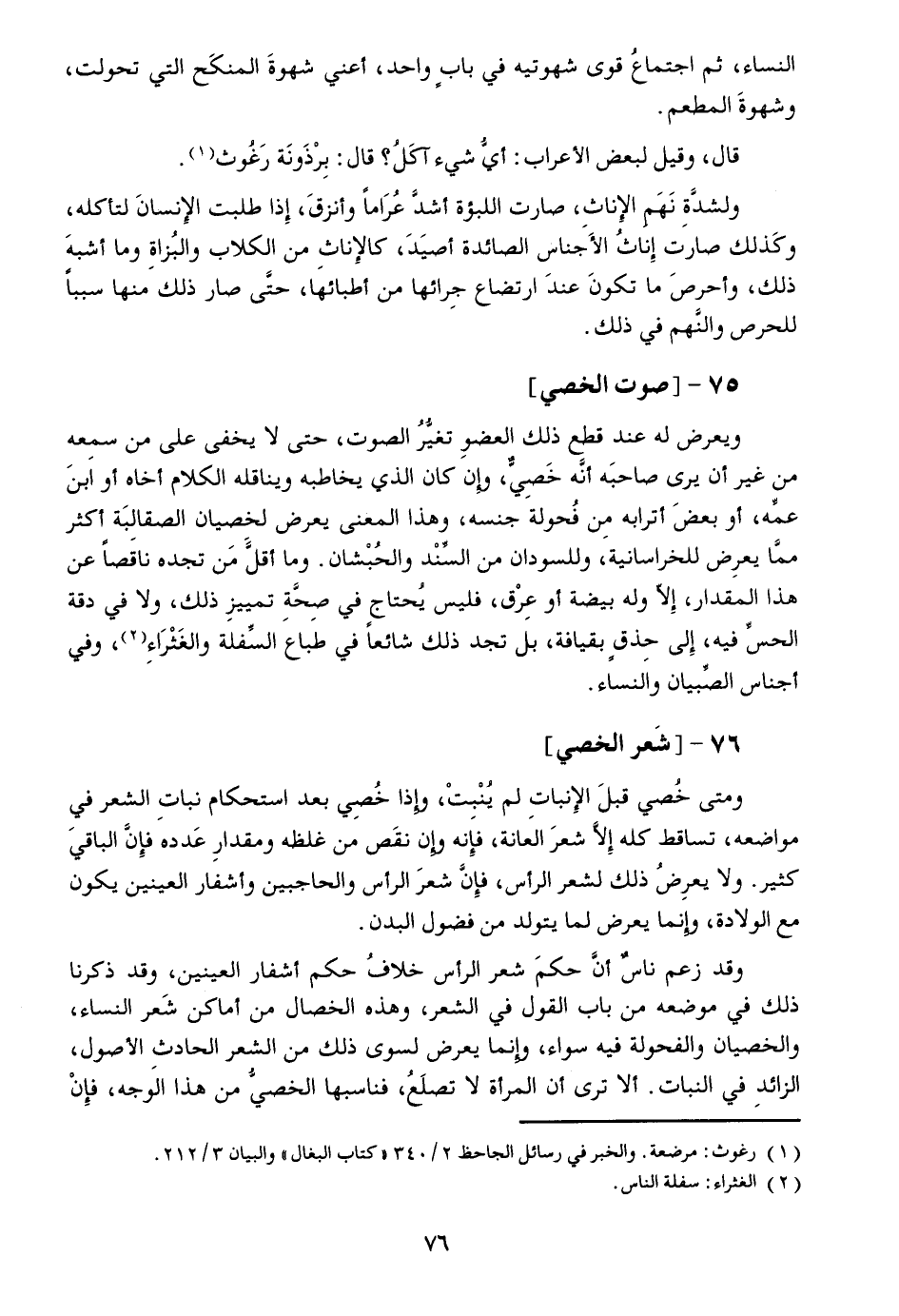 ويعرض له عند قطع ذلك العضو تغيّر الصوت، حتى لا يخفى على من سمعه من غير أن يرى صاحبه أنّه خصيّ، وإن كان الذي يخاطبه ويناقله الكلام أخاه أو ابن عمّه، أو بعض أترابه من فحولة جنسه، وهذا المعنى يعرض لخصيان الصقالبة أكثر ممّا يعرض للخراسانية، وللسودان من السّند والحبشان. وما أقلّ من تجده ناقصا عن هذا المقدار، إلّا وله بيضة أو عرق، فليس يحتاج في صحّة تمييز ذلك، ولا في دقة الحسّ فيه، إلى حذق بقيافة، بل تجد ذلك شائعا في طباع السّفلة والغثراء «2» ، وفي أجناس الصّبيان والنساء.