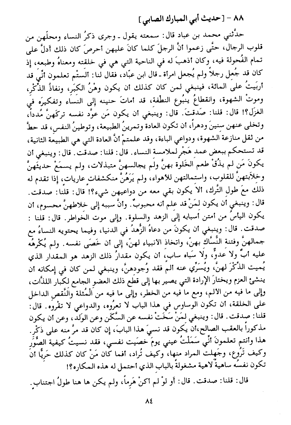 حدّثني محمد بن عباد قال: سمعته يقول- وجرى ذكر النساء ومحلّهن من قلوب الرجال، حتّى زعموا أنّ الرجل كلما كان عليهن أحرص كان ذلك أدلّ على تمام الفحولة فيه، وكان أذهب له في الناحية التي هي في خلقته ومعناه وطبعه، إذ كان قد جعل رجلا ولم يجعل امرأة- قال ابن عبّاد، فقال لنا: ألستم تعلمون أنّي قد أربيت على المائة، فينبغي لمن كان كذلك أن يكون وهن الكبر، ونفاذ الذّكر، وموت الشهوة، وانقطاع ينبوع النطفة، قد أمات حنينه إلى النساء وتفكيره في الغزل؟! قال: قلنا: صدقت. قال: وينبغي أن يكون من عوّد نفسه تركهنّ مددا، وتخلى عنهن سنين ودهرا، أن تكون العادة وتمرين الطبيعة، وتوطين النفس، قد حطّ من ثقل منازعة الشهوة، ودواعي الباءة، وقد علمتم أنّ العادة التي هي الطبيعة الثانية، قد تستحكم ببعض عمد هجر لملامسة النساء. قال: قلنا: صدقت. قال: وينبغي أن يكون من لم يذق طعم الخلوة بهنّ ولم يجالسهنّ متبذلات، ولم يسمع حديثهنّ وخلابتهنّ للقلوب، واستمالتهن للأهواء، ولم يرهنّ منكشفات عاريات، إذا تقدم له ذلك مع طول التّرك، ألا يكون بقي معه من دواعيهن شيء؟! قال: قلنا: صدقت.