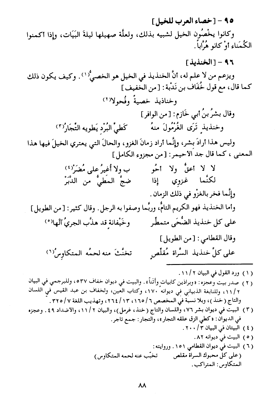 ويزعم من لا علم له، أنّ الخنذيذ في الخيل هو الخصيّ «1» . وكيف يكون ذلك كما قال، مع قول خفاف بن ندبة: [من الخفيف]
