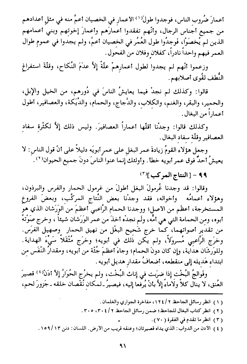 وجعل هؤلاء القوم زيادة عمر البغل على عمر أبويه دليلا على أنّ قول الناس: لا يعيش أحد فوق عمر أبويه خطأ. وأولئك إنما عنوا الناس دون جميع الحيوان «2» .