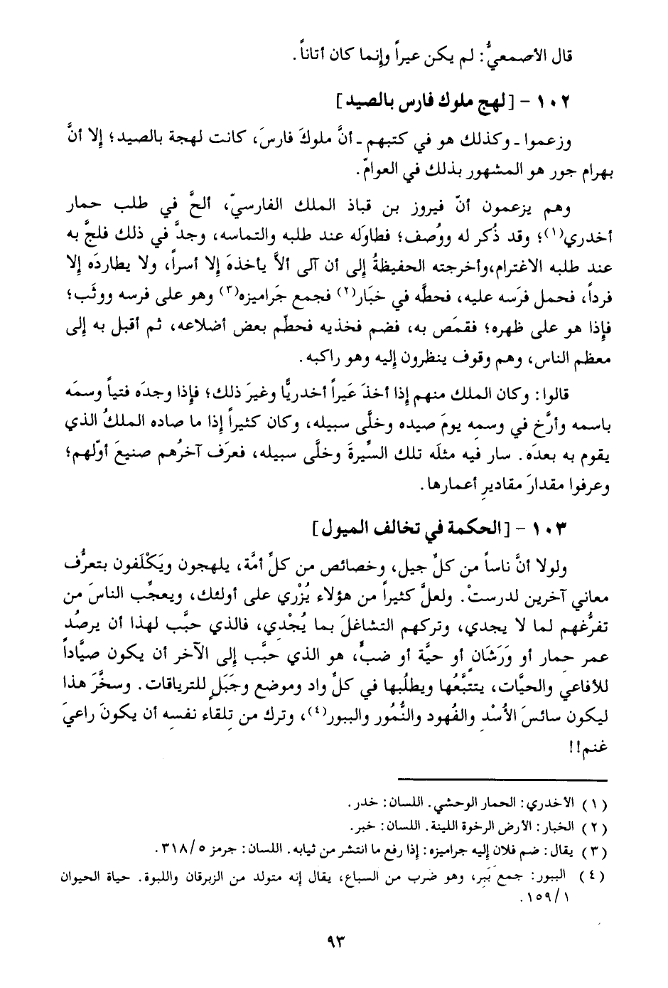 وزعموا- وكذلك هو في كتبهم- أنّ ملوك فارس، كانت لهجة بالصيد؛ إلا أنّ بهرام جور هو المشهور بذلك في العوامّ.
