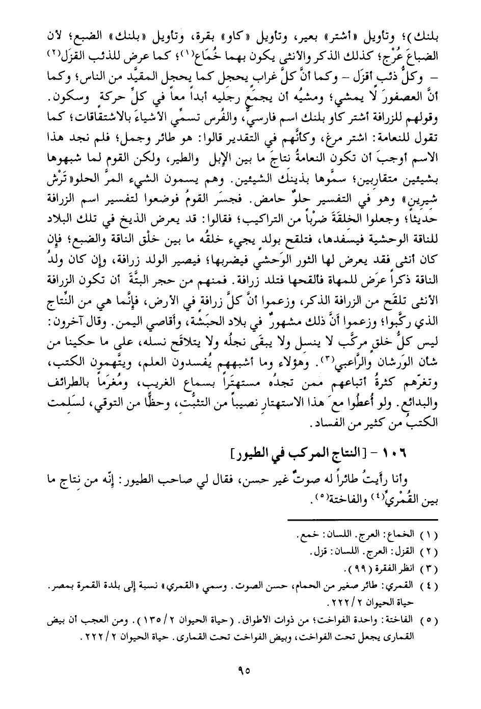 وقولهم للزرافة أشتر كاو بلنك اسم فارسيّ، والفرس تسمّي الأشياء بالاشتقاقات؛ كما تقول للنعامة: اشتر مرغ، وكأنّهم في التقدير قالوا: هو طائر وجمل؛ فلم نجد هذا الاسم أوجب أن تكون النعامة نتاج ما بين الإبل والطير، ولكن القوم لما شبهوها بشيئين متقاربين؛ سمّوها بذينك الشيئين. وهم يسمون الشيء المرّ الحلو «ترش شيرين» وهو في التفسير حلو حامض. فجسر القوم فوضعوا لتفسير اسم الزرافة حديثا؛ وجعلوا الخلقة ضربا من التراكيب؛ فقالوا: قد يعرض الذيخ في تلك البلاد للناقة الوحشية فيسفدها، فتلقح بولد يجيء خلقه ما بين خلق الناقة والضبع؛ فإن كان أنثى فقد يعرض لها الثور الوحشي فيضربها؛ فيصير الولد زرافة، وإن كان ولد الناقة ذكرا عرض للمهاة فألقحها فتلد زرافة. فمنهم من حجر البتّة أن تكون الزرافة الأنثى تلقح من الزرافة الذكر، وزعموا أنّ كلّ زرافة في الأرض، فإنّما هي من النّتاج الذي ركّبوا؛ وزعموا أنّ ذلك مشهور في بلاد الحبشة، وأقاصي اليمن. وقال آخرون: