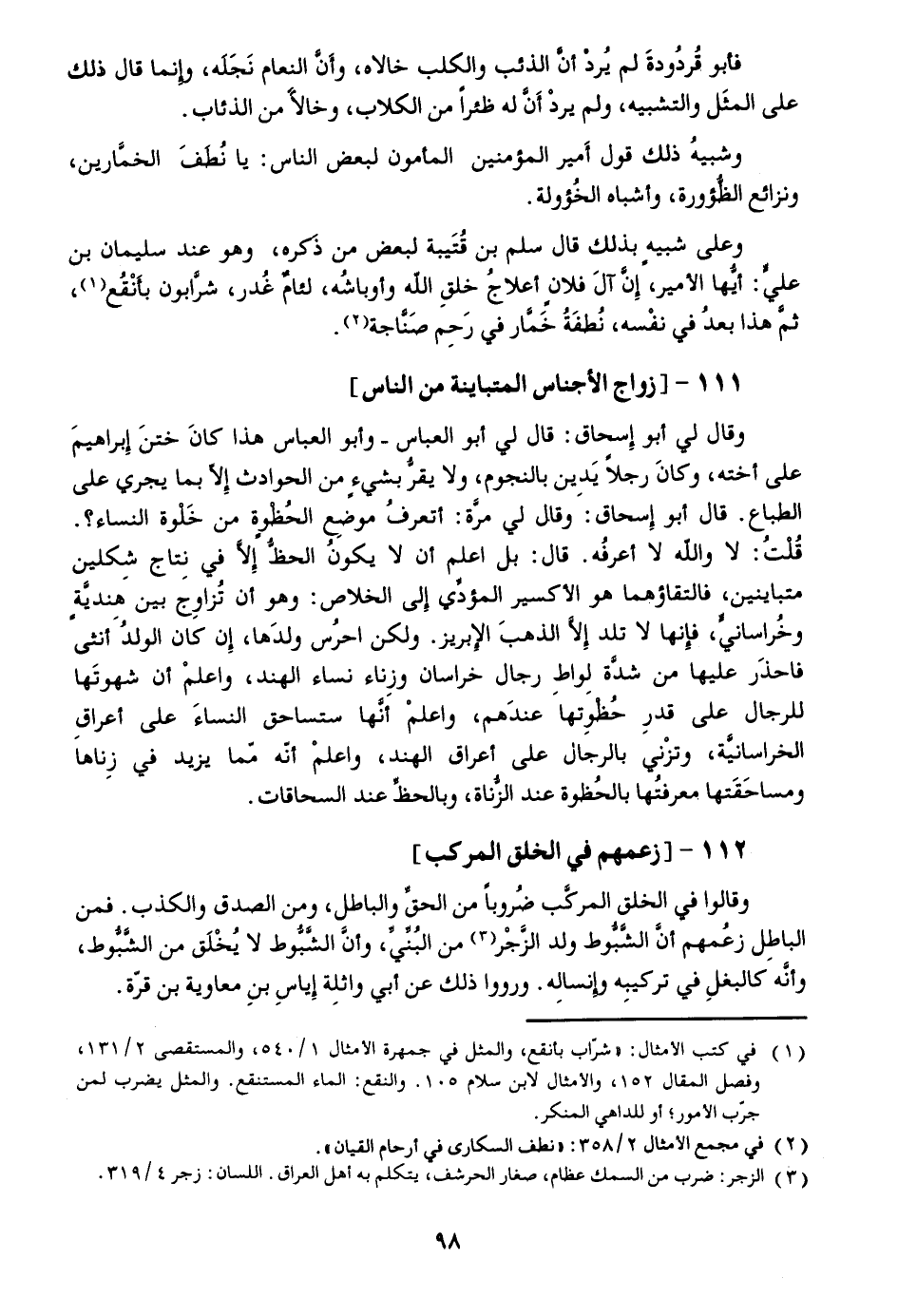 قلت: لا والله لا أعرفه. قال: بل اعلم أن لا يكون الحظّ إلّا في نتاج شكلين متباينين، فالتقاؤهما هو الأكسير المؤدّي إلى الخلاص: وهو أن تزاوج بين هنديّة وخراسانيّ، فإنها لا تلد إلّا الذهب الإبريز. ولكن احرس ولدها، إن كان الولد أنثى فاحذر عليها من شدّة لواط رجال خراسان وزناء نساء الهند، واعلم أن شهوتها للرجال على قدر حظوتها عندهم، واعلم أنّها ستساحق النساء على أعراق الخراسانيّة، وتزني بالرجال على أعراق الهند، واعلم أنّه ممّا يزيد في زناها ومساحقتها معرفتها بالحظوة عند الزّناة، وبالحظّ عند السحاقات.