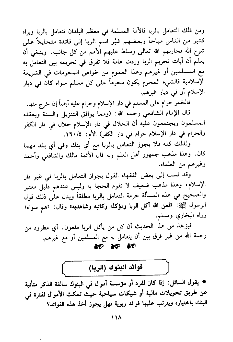 ولذلك كله فلا يجوز التعامل بالربا مع أي بنك وفي أي بلد مهما كان. وهذا مذهب جمهور أهل العلم وبه قال الأئمة مالك والشافعي وأحمد وغيرهم من العلماء.