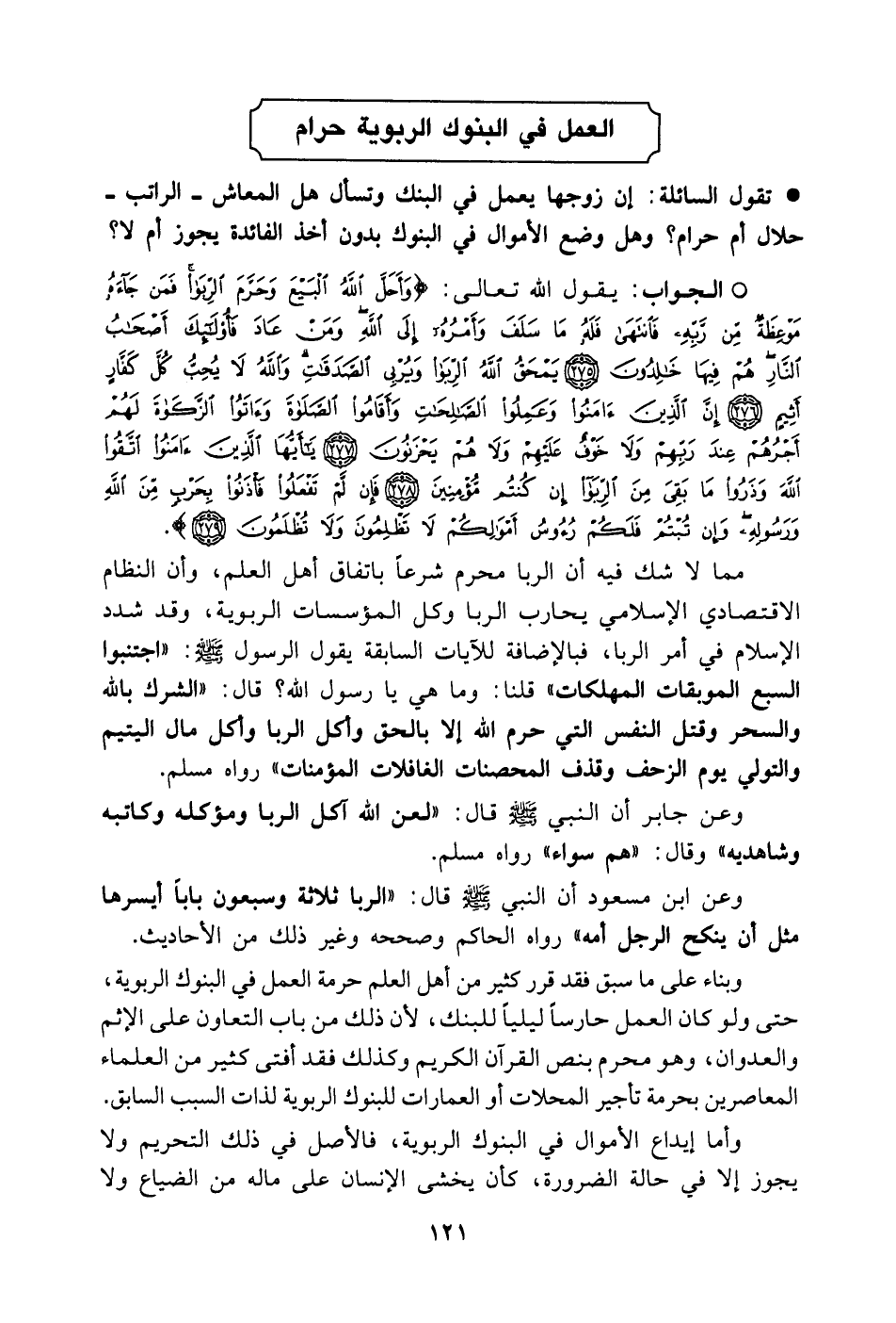 تقول السائلة: إن زوجها يعمل في البنك وتسأل هل المعاش - الراتب - حلال أم حرام؟ وهل وضع الأموال في البنوك بدون أخذ الفائدة يجوز أم لا؟