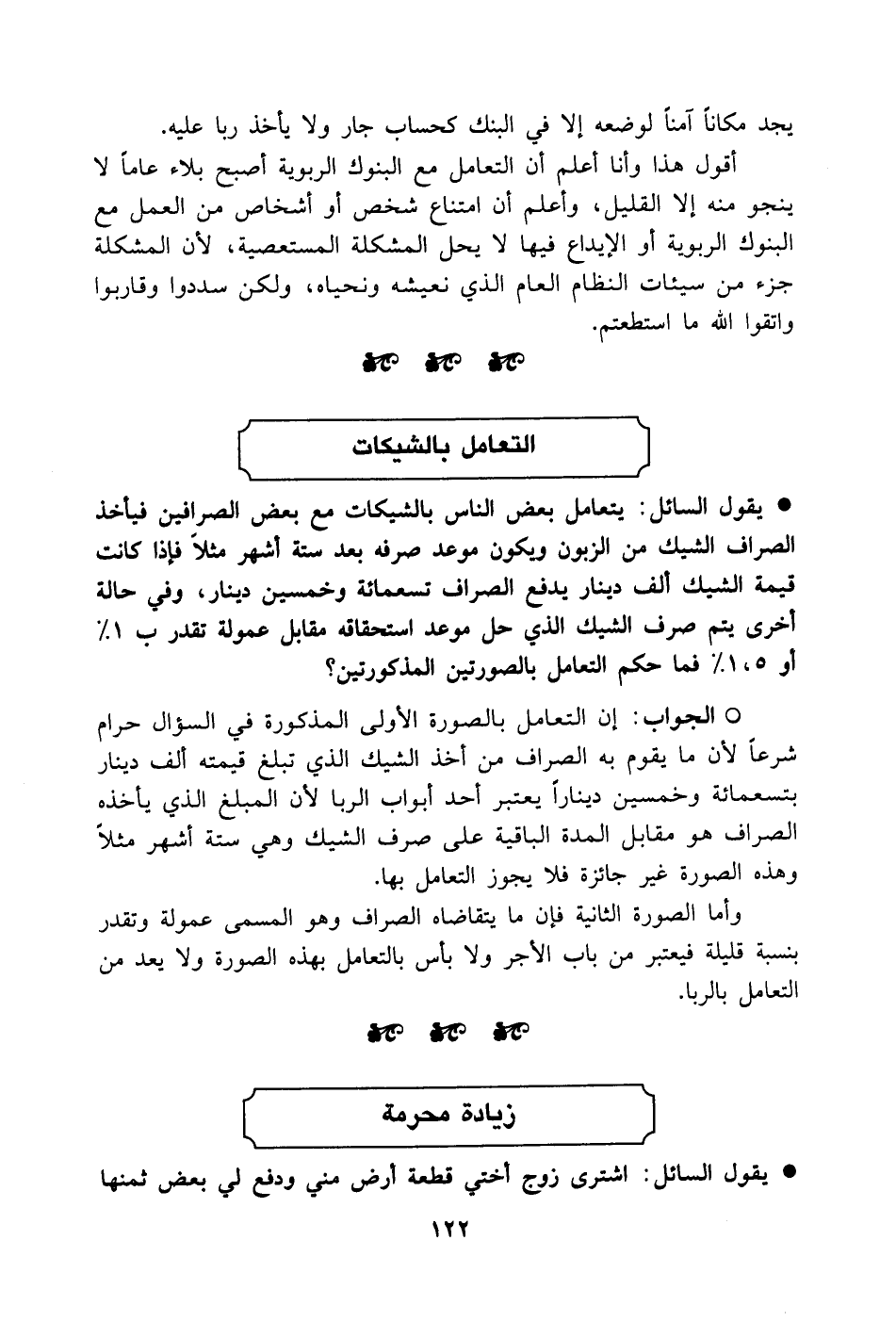الجواب: إن التعامل بالصورة الأولى المذكورة في السؤال حرام شرعاً لأن ما يقوم به الصراف من أخذ الشيك الذي تبلغ قيمته ألف دينار بتسعمائة وخمسين ديناراً يعتبر أحد أبواب الربا لأن المبلغ الذي يأخذه الصراف هو مقابل المدة الباقية على صرف الشيك وهي ستة أشهر مثلاً وهذه الصورة غير جائزة لا يجوز التعامل بها.