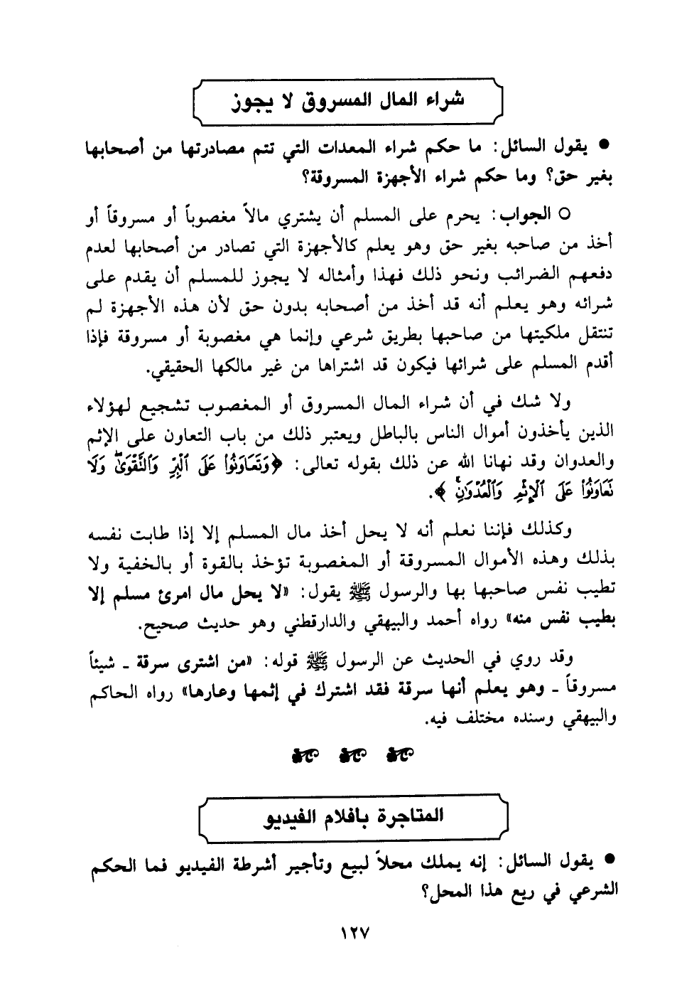 وقد روي في الحديث عن الرسول صلى الله عليه وسلم قوله: (من اشترى سرقة - شيئاً مسروقاً - وهو يعلم أنها سرقة فقد اشترك في إثمها وعارها) رواه الحاكم والبيهقي وسنده مختلف فيه.