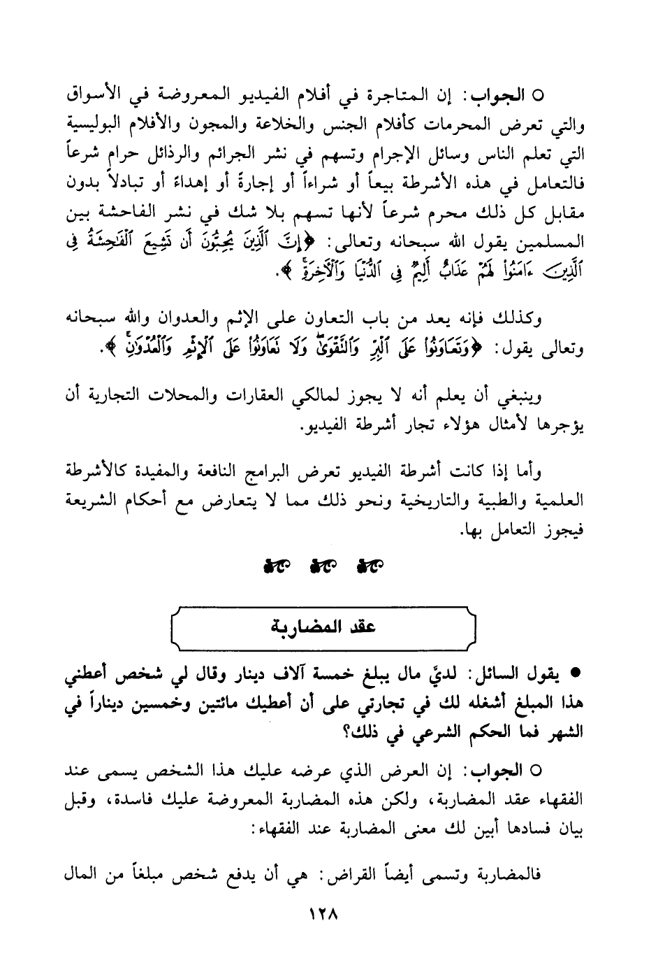 الجواب: إن المتاجرة في أفلام الفيديو المعروضة في الأسواق والتي تعرض المحرمات كأفلام الجنس والخلاعة والمجون والرذائل والأفلام البوليسية التي تعلم الناس وسائل الإجرام وتسهم في نشر الجرائم والرذائل حرام شرعاً، فالتعامل في هذه الأشرطة بيعاً أو شراءاً أو إجارة أو إهداءً أو تبادلاً بدون مقابل كل ذلك محرم شرعاً لأنها تسهم بلا شك في نشر الفاحشة بين المسلمين يقول الله سبحانه وتعالى: (إِنَّ الَّذِينَ يُحِبُّونَ أَنْ تَشِيعَ الْفَاحِشَةُ فِي الَّذِينَءَامَنُوا لَهُمْ عَذَابٌ أَلِيمٌ فِي الدُّنْيَا وَالْآخِرَةِ).