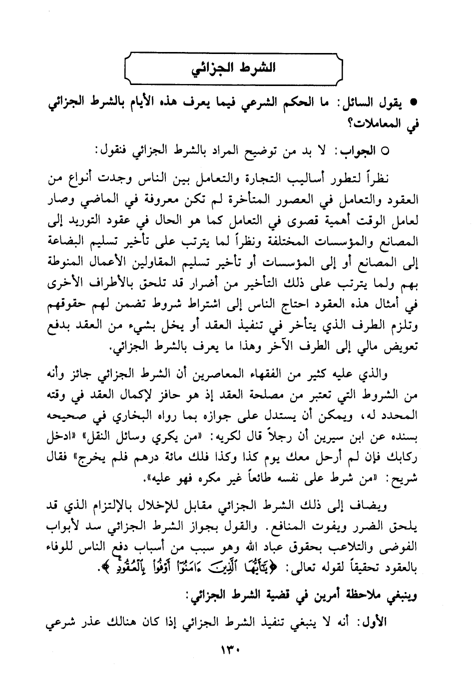 يقول السائل: ما الحكم الشرعي فيما يعرف هذه الأيام بالشرط الجزائي في المعاملات؟