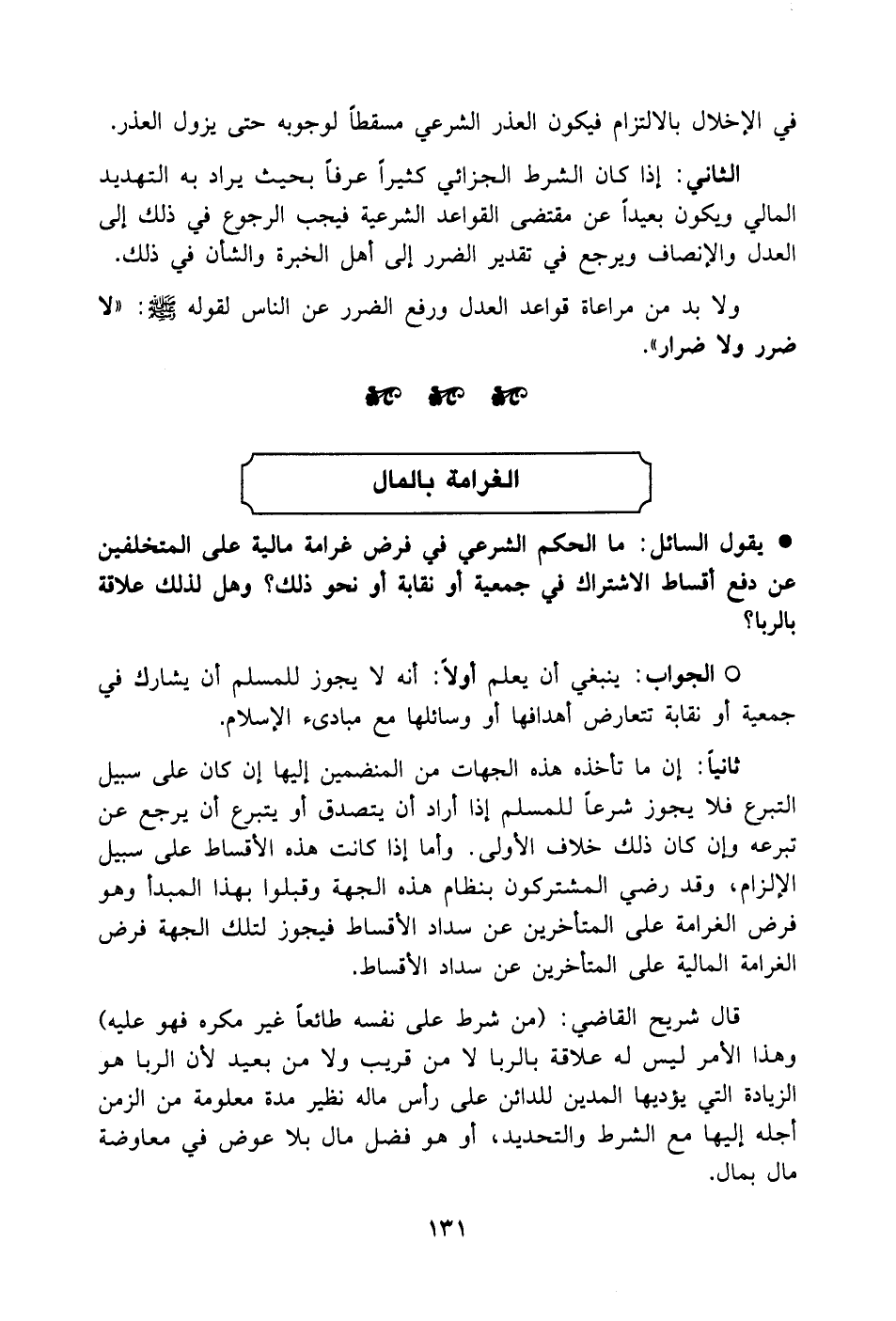 ثانياً: إن ما تأخذه هذه الجهات من المنضمين إليها إن كان على سبيل التبرع فلا يجوز لها فرض غرامة على المتأخرين في سداد هذه الأقساط لأن المتطوع أمير نفسه فيجوز شرعاً للمسلم إذا أراد أن يتبرع أن يرجع عن تبرعه وإن كان ذلك خلاف الأولى. وأما إذا كانت هذه الأقساط على سبيل الإلزام، وقد رضي المشتركون في نظام هذه الجهة وقبلوا بهذا المبدأ وهو فرض الغرامة على المتأخرين في سداد هذه الأقساط فيجوز لتلك الجهة فرض الغرامة المالية على المتأخرين عن سداد القساط.