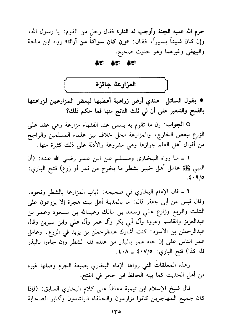 قال شيخ الإسلام ابن تيمية معلقاً على كلام البخاري السابق (فإذا كان جميع المهاجرين كانوا يزارعون والخلفاء الراشدون وأكابر الصحابة