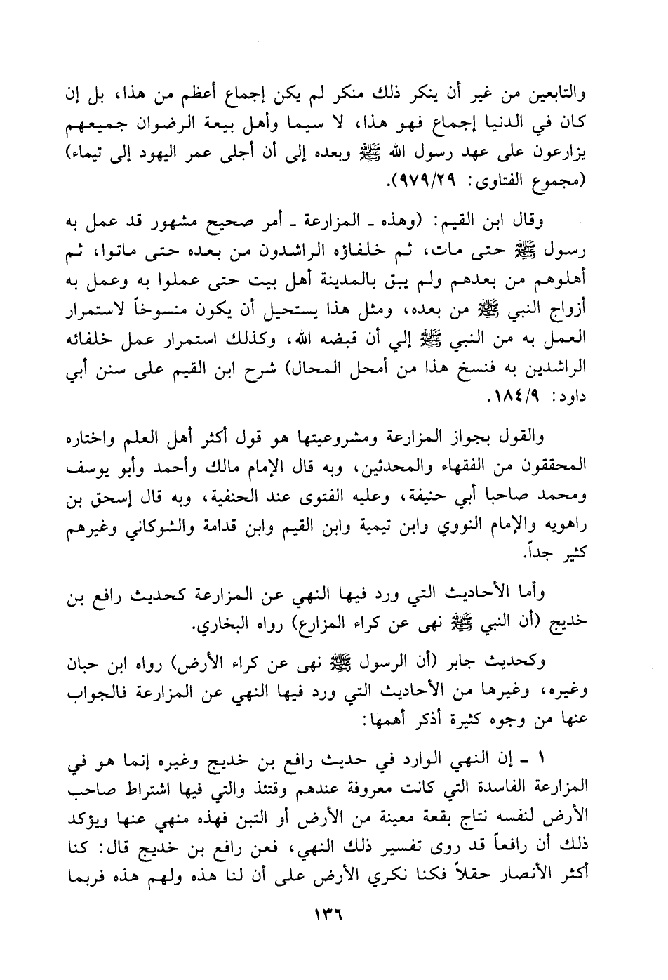 وقال ابن القيم: (وهذه - المزارعة - أمر صحيح مشهور قد عمل به رسول الله صلى الله عليه وسلم حتى مات، ثم خلفاؤه الراشدون من بعده حتى ماتوا، ثم أهلوهم من بعدهم ولم يبقَ في المدينة أهل بيت حتى عملوا به وعمل به أزواج النبي صلى الله عليه وسلم من بعده، ومثل هذا يستحيل أن يكون منسوخاً لاستمرار العمل به من النبي صلى الله عليه وسلم، إلى أن قبضه الله، وكذلك استمرار عمل خلفائه الراشدين به فنسخ هذا من أمحل المحال) شرح ابن القيم على سنن أبي داود 9/ 184.