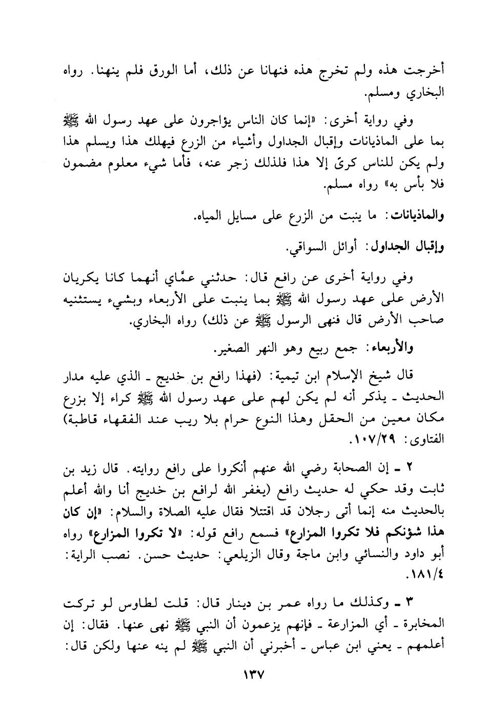 وفي رواية أخرى عن رافع قال: (حدَّثني عمايَّ أنهما كانا يكريان الأرض على عهد رسول الله صلى الله عليه وسلم بنا ينبت على الإربعاء وبشيءٍ يستثنيه صاحب الأرض قال فنهى الرسول صلى الله عليه وسلم عن ذلك) رواه البخاري.