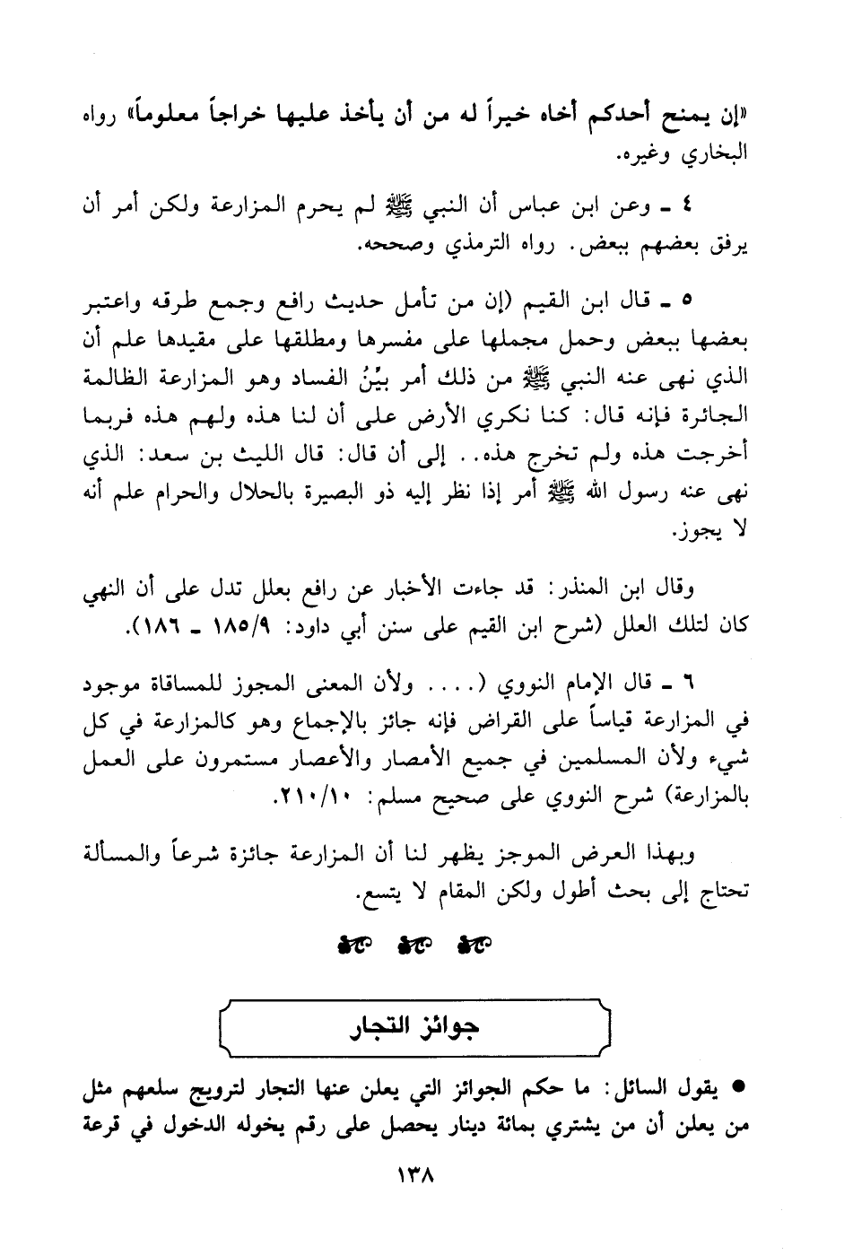 4. وعن ابن عباس أن النبي صلى الله عليه وسلم لم يحرم المزارعة ولكن امر ان يرفق بعضهم ببعض. رواه الترمذي وصححه.