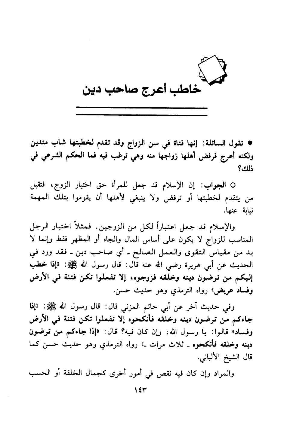 وفي حديث آخر عن أبي حاتم المزني قال: قال رسول الله صلى الله عليه وسلم (إذا جاءكم من ترضون دينه وخلقه فأنكحوه إلا تفعلوا تكن فتنةٌ في الأرض وفساد قالوا: يا رسول الله وإن كان فيه؟ قال: إذا جاءكم من ترضون دينه وخلقه فأنكحوه " ثلاث مرات ") رواه الترمذي وهو حديثٌ حسن كما قال الشيخ الألباني.
