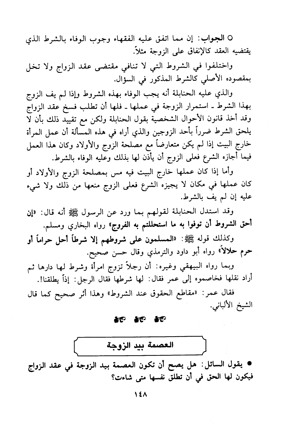 والذي عليه الحنابلة أنه يجب الوفاء بهذه الشروط وإذا لم يف الزوج بهذا الشرط - استمرار الزوجة في عملها - فلها أن تطلب فسخ عقد الزواج وقد أخذ قانون الأحوال الشخصية بقول الحنابلة ولكن مع تقييد ذلك بأن لا يلحق الشرط ضرراً بأحد الزوجين والذي أراه في هذه المسألة أن عمل المرأة خارج البيت إذا لم يكن متعارضاً مع مصلحة الزوج والأولاد وكان هذا العمل فيما أجازه الشرع فعلى الزوج أن يأذن لها بذلك وعليه الوفاء بالشرط.