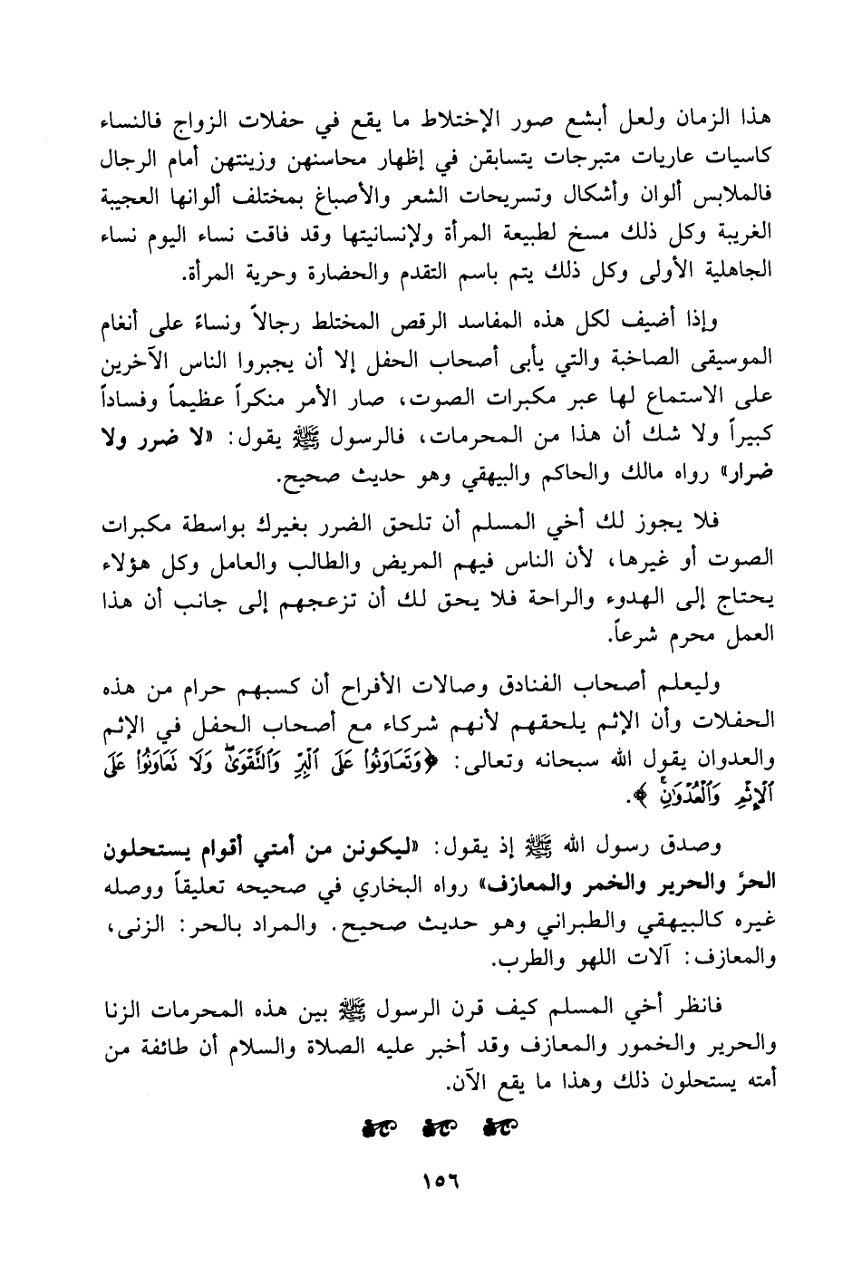 هذا الزمان ولعل أبشع صور الاختلاط ما يقع في حفلات الزواج فالنساء كاسيات عاريات متبرجات يتسابقن في إظهار محاسنهن وزينتهن أمام الرجال فالملابس ألوان وأشكال وتسريحات الشعر والأصباغ بمختلف ألوانها العجيبة الغريبة وكل ذلك مسخ لطبيعة المرأة ولإنسانيتها وقد فاقت نساء اليوم نساء الجاهلية الأولى وكل ذلك يتم باسم التقدم والحضارة وحرية المرأة.