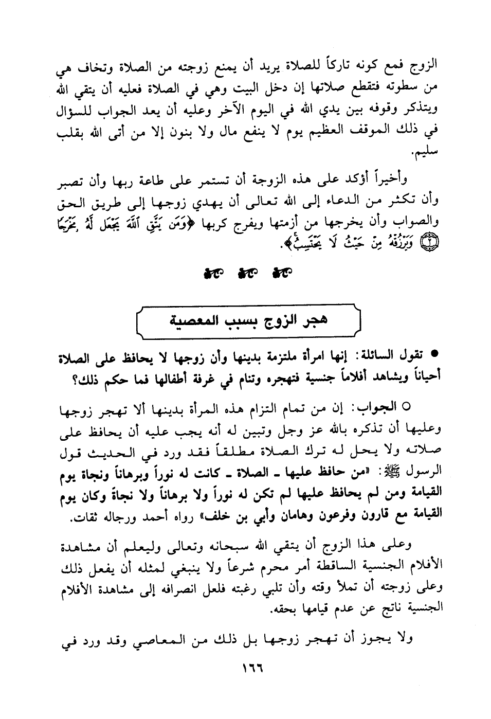 تقول السائلة: إنها امرأة ملتزمة بدينها وأن زوجها لا يحافظ على الصلاة أحياناً ويشاهد أفلاماً جنسية فتهجره وتنام في غرفة أطفالها فما حكم ذلك؟