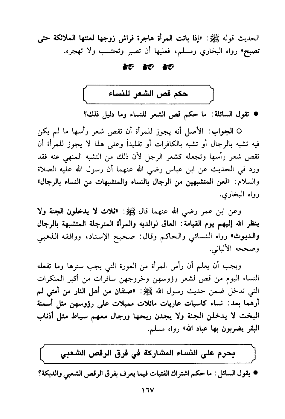 ويجب أن يعلم أن رأس المرأة من العورة التي يجب سترها وما تفعله النساء اليوم من قصٍ لشعر رؤوسهن وخروجهن سافرات من أكبر المنكرات التي تدخل ضمن حديث رسول الله صلى الله عليه وسلم (صنفان من أهل النار من أمتي لم أرهما بعد: نساءٌ كاسياتٌ عاريات مائلات مميلات على رؤوسهن مثل أسمنة البخت لا يدخلن الجنة ولا يجدن ريحها ورجالٌ معهم سياط مثل أذناب البقر يضربون بها عباد الله) رواه مسلم.