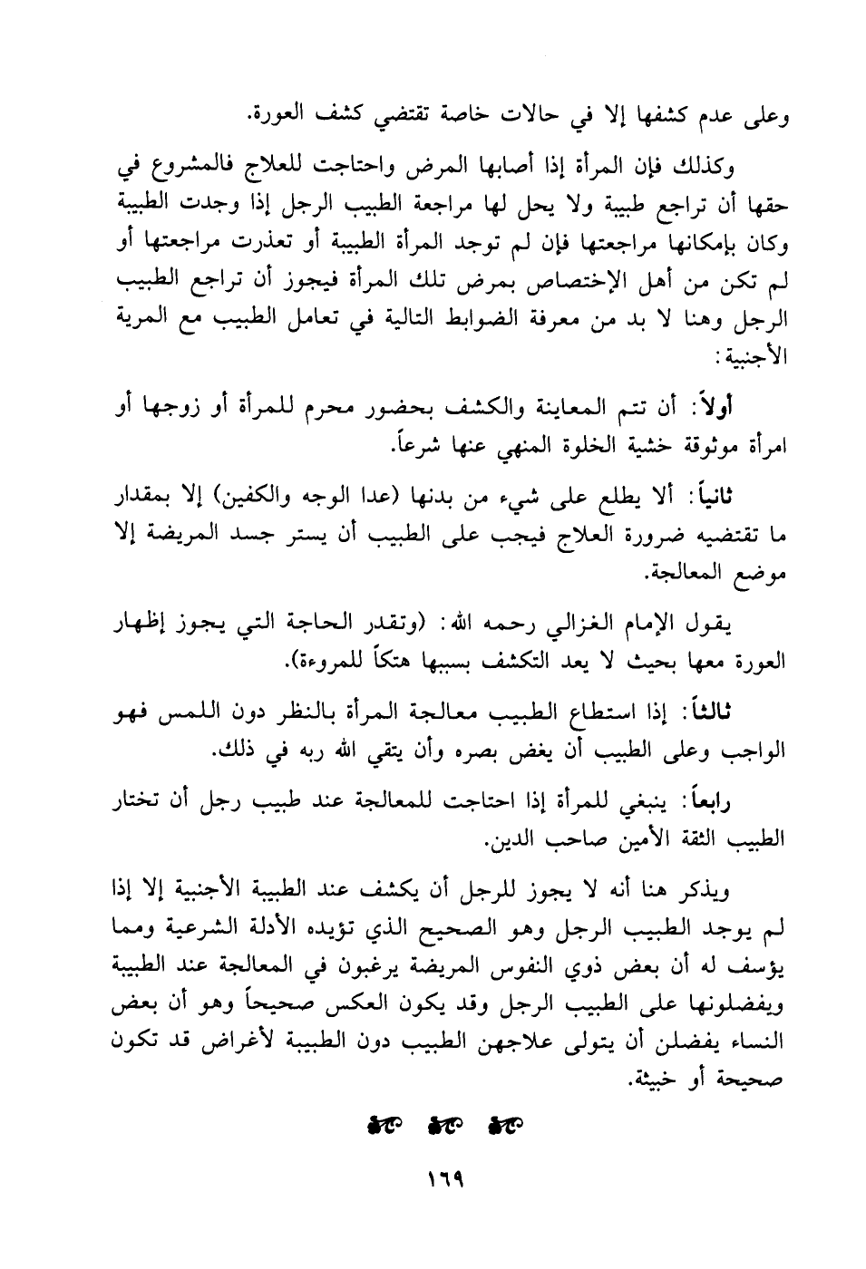 ثانياً: ألا يطلع على شيء من بدنها (عدا الوجه والكفين) إلا بمقدار ما يقتضيه العلاج فيجب على الطبيب أن يستر جسم المريضة إلا موضع المعالجة.