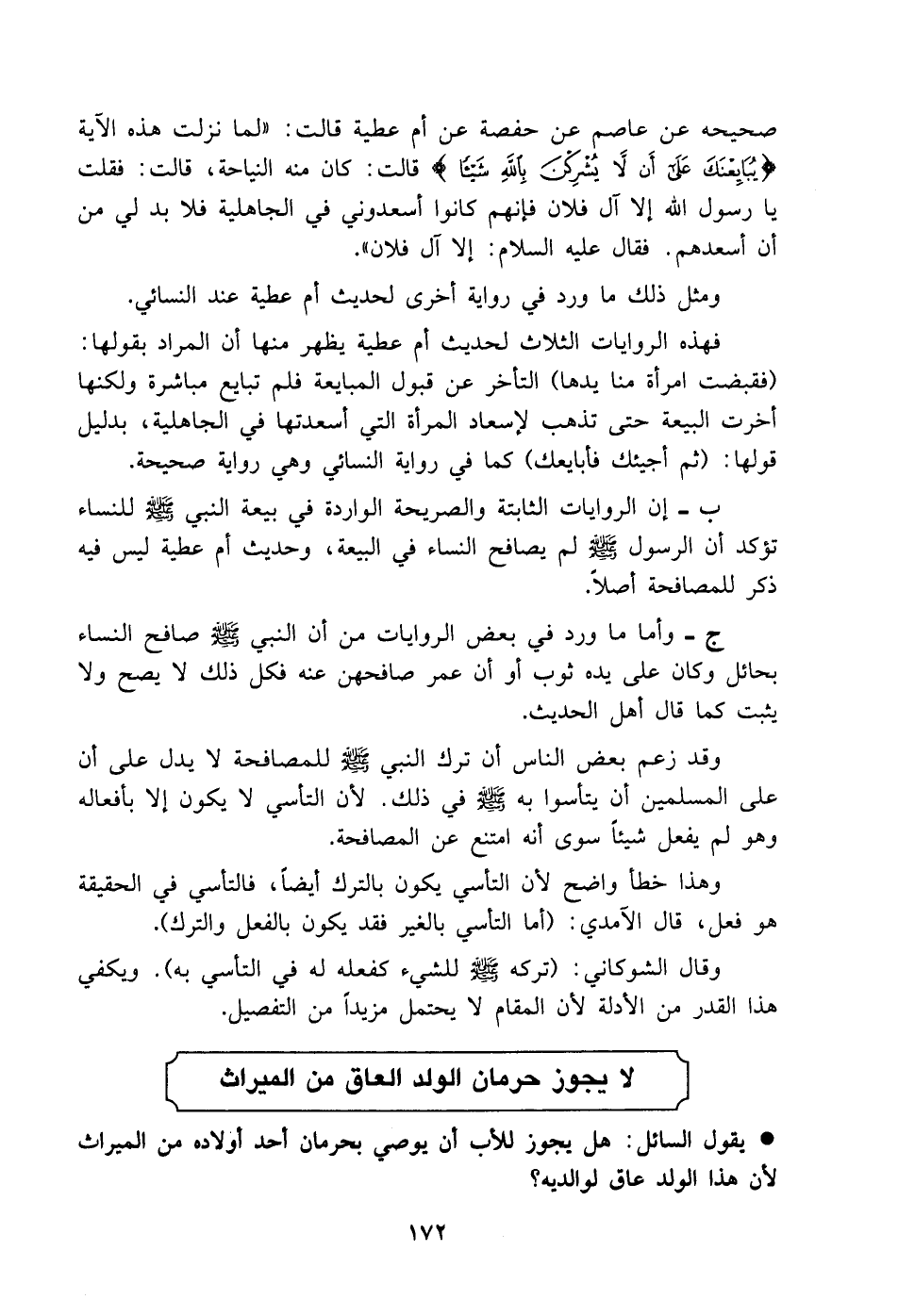ب. إن الروايات الثابتة والصريحة الواردة في بيعة النبي صلى الله عليه وسلم للنساء تؤكد أن الرسول صلى الله عليه وسلم لم يصافح النساء في البيعة، وحديث أم عطية ليس فيه ذكر للمصافحة أصلاً.
