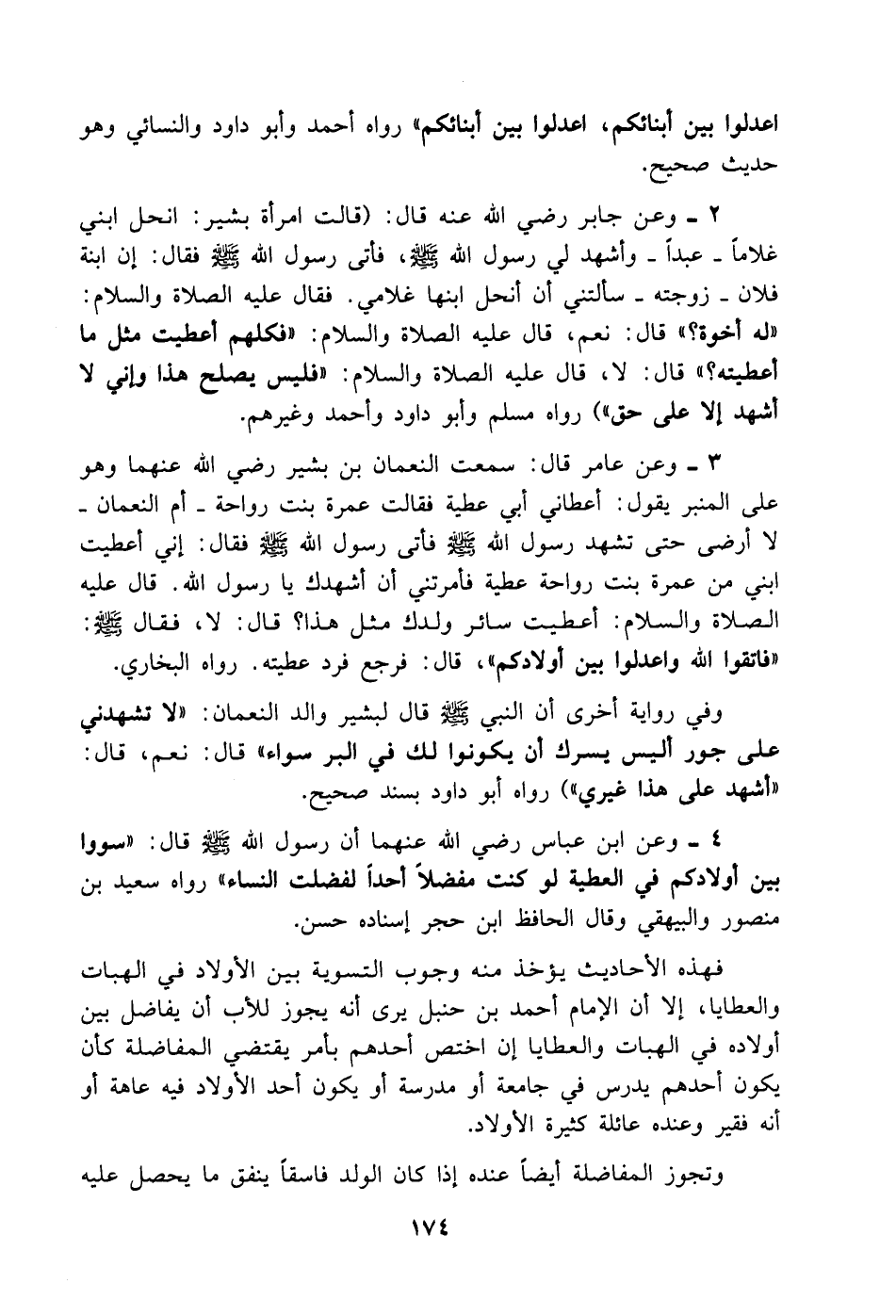 2. وعن جابر رضي الله عنه قال: قالت امرأة بشير: انحل ابني غلاماً - عبداً - وأشهد لي رسول الله صلى الله عليه وسلم فأتى رسول الله صلى الله عليه وسلم فقال: إن ابنة فلان - زوجته - سألتني أن أنحل ابنها غلامي. فقال عليه الصلاة والسلام: له أخوة؟ قال: نعم، قال عليه الصلاة والسلام: فكلهم أعطيت مثل ما أعطيته؟ قال: لا، قال عليه الصلاة والسلام: فليس يصلح هذا وإني لا أشهد إلا على حق) رواه مسلم وأبو داود وأحمد وغيرهم.