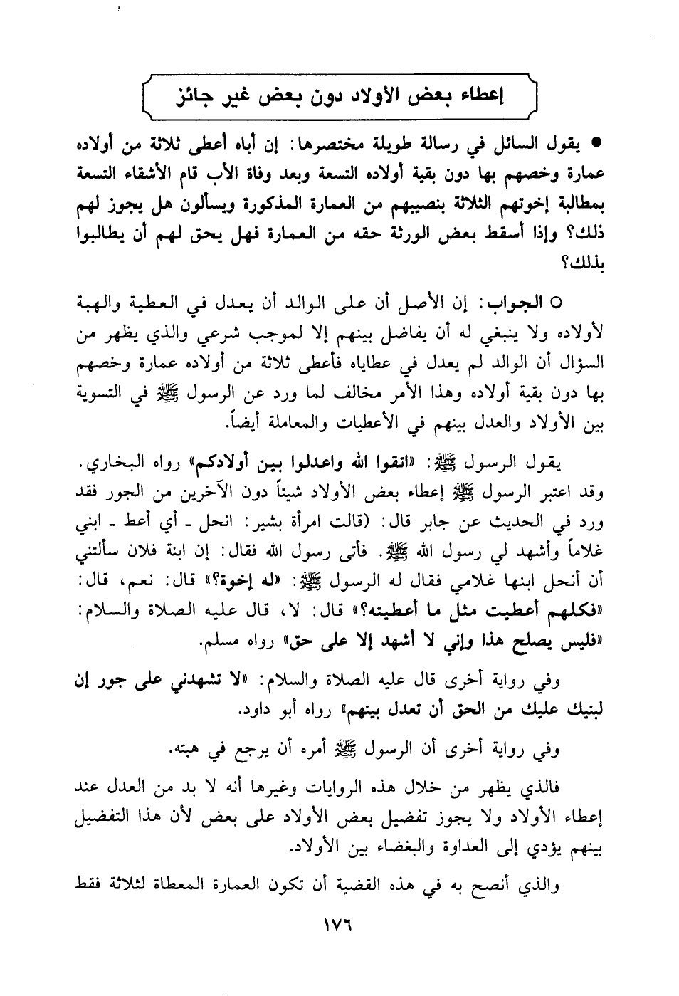 يقول الرسول صلى الله عليه وسلم: (اتقوا الله واعدلوا بين أولادكم) رواه البخاري. وقد اعتبر الرسول صلى الله عليه وسلم إعطاء بعض الأولاد شيئاً دون الآخرين من الجور فقد ورد في الحديث عن جابر قال: قالت امرأة بشير: إنحل - أي أعط - ابني غلام وأشهد لي رسول الله صلى الله عليه وسلم. فأتى رسول الله فقال: إن ابنة فلان سألتني أن أنحل ابنها غلامي فقال له الرسول صلى الله عليه وسلم: (له إخوة؟ قال: نعم. قال: فكلهم أعطيت مثل ما أعطيته. قال: لا. فقال له عليه الصلاة والسلام: فليس يصلح هذا وإني لا أشهد إلا على حق) رواه مسلم.