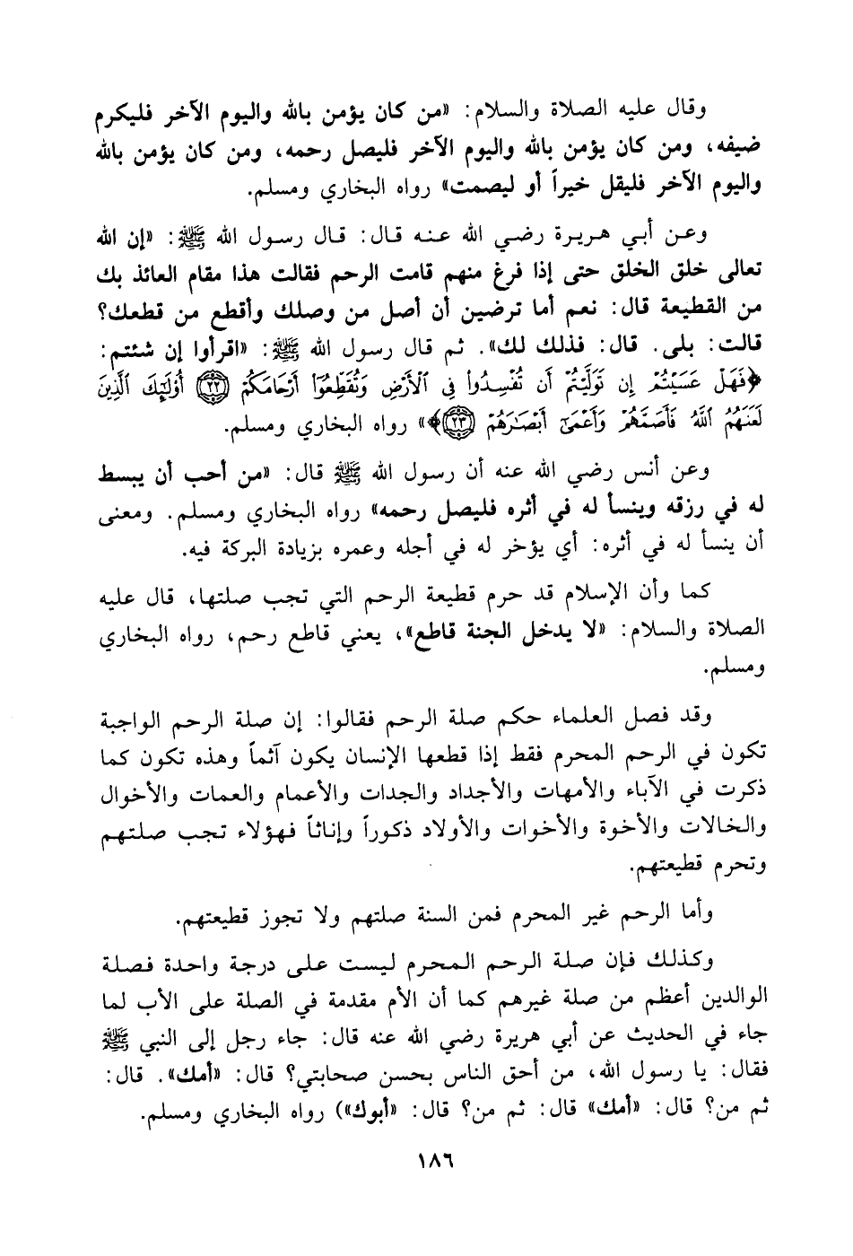 وعن أبي هريرة رضي الله عنه قال: قال رسول الله صلى الله عليه وسلم: (إن الله تعالى خلق الخلق حتى إذا فرغ منه قامت الرحم فقالت هذا مقام العائذ بك من القطيعة قال: نعم أما ترضين أن أصل من وصلك وأقطع من قطعك؟ قالت: بلى. قال: فذلك لك. ثم قال رسول الله صلى الله عليه وسلم: إقرأوا إن شئتم فهل عسيتم إن توليتم أن تفسدوا في الأرض وتقطعوا ارحامكم أولئك لعنهم الله فأصمهم وأعمى أبصارهم) رواه البخاري ومسلم.