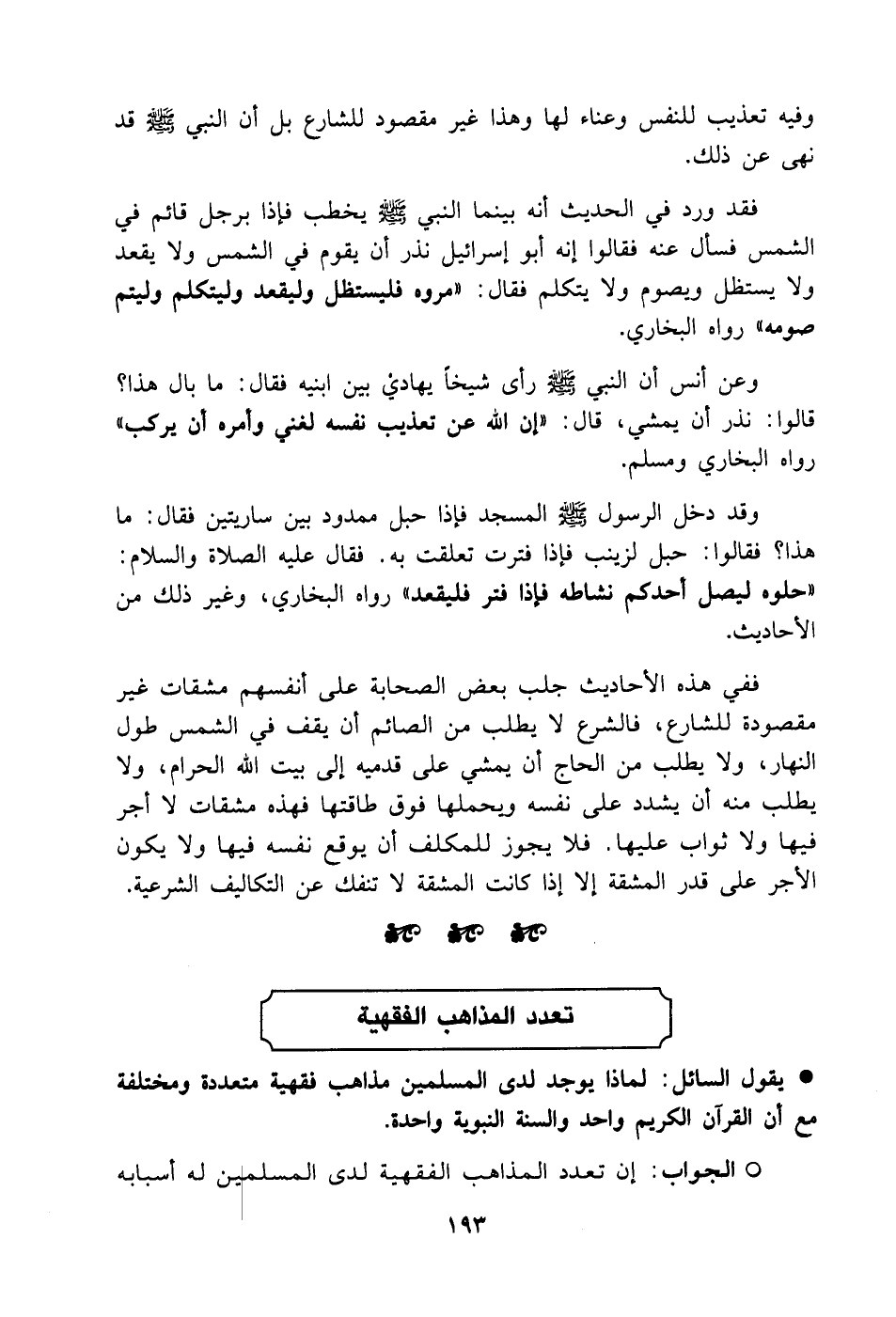 ففي هذه الأحاديث جلب الصحابة على أنفسهم مشقات غير مقصودة للشارع، فالشرع لا يطلب من الصائم أن يقف في الشمس طول النهار ولا يطلب من الحاج أن يمشي على قدميه إلى بيت الله الحرام ولا يطلب منه أن يشدد على نفسه ويحملها فوق طاقتها فهذه مشقات لا أجر فيها ولا ثواب عليها. فلا يجوز للمكلف أن يوقع نفسه فيها ولا يكون الأجر على قدر المشقة إلا إذا كانت المشقة لا تنفك عن التكاليف الشرعية.