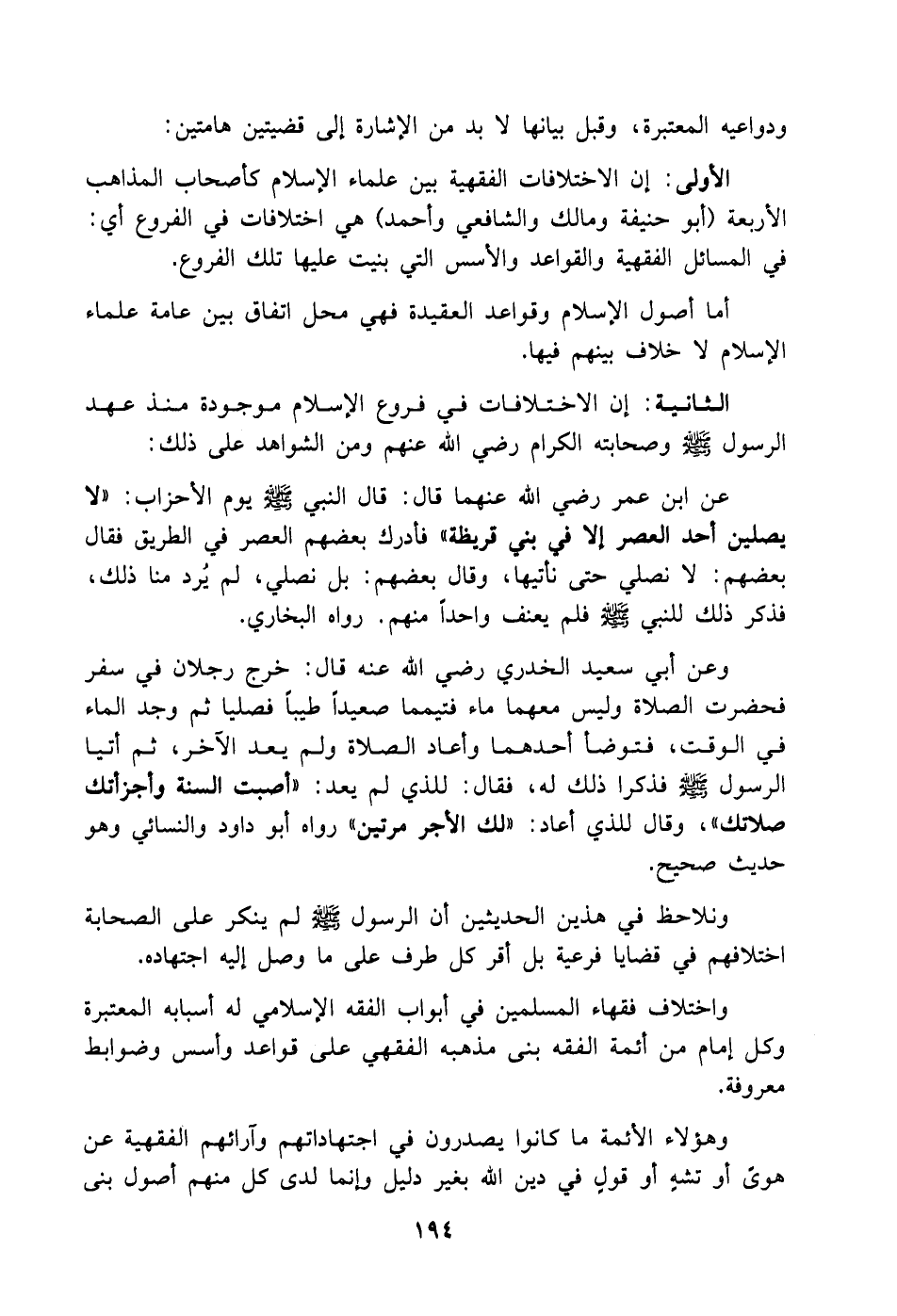 ونلاحظ في هذين الحديثين أن الرسول صلى الله عليه وسلم لم ينكر على الصحابة اختلافهم في قضايا فرعية بل أقر كل طرف على ما وصل إليه اجتهاده.