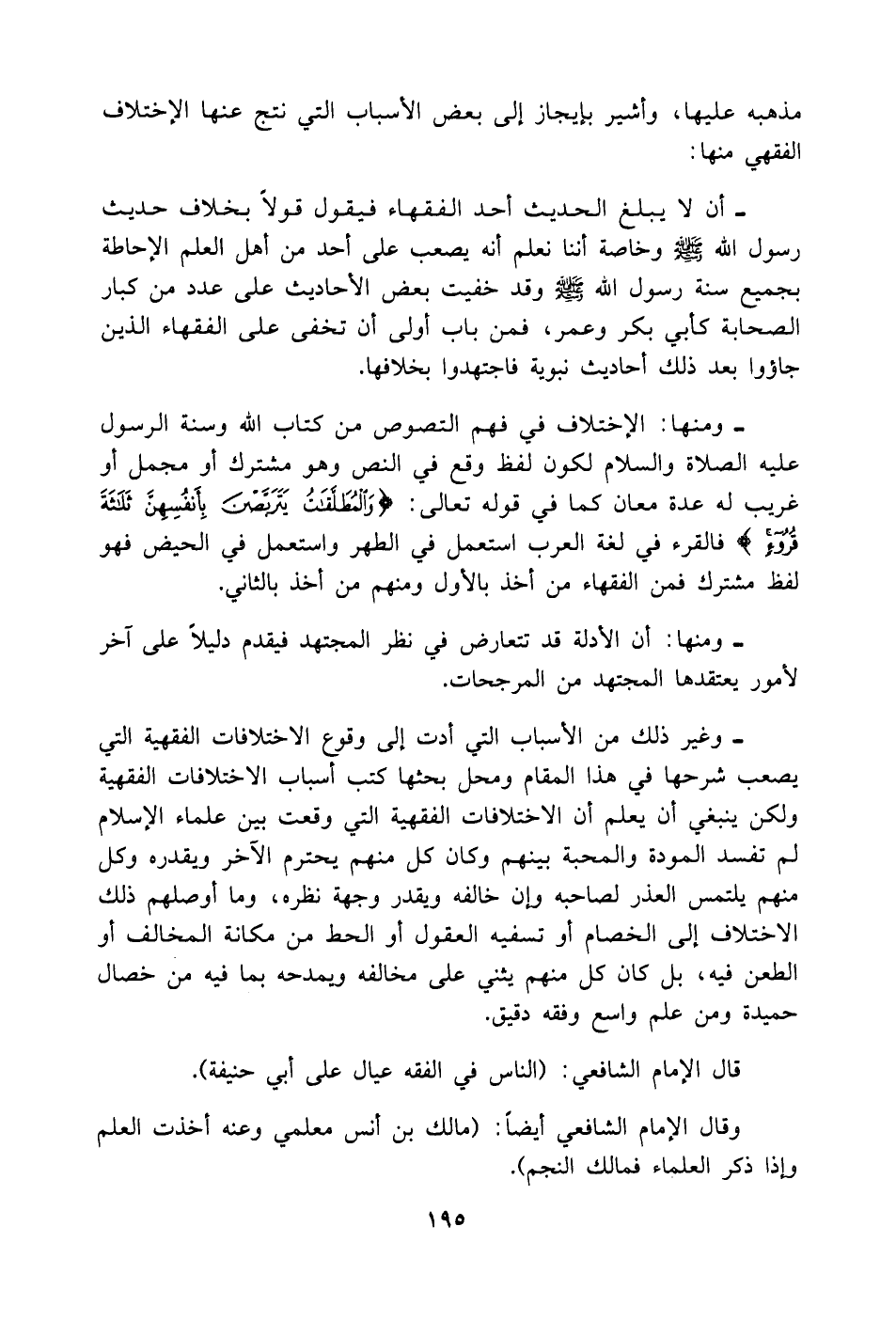 مذهبه عليها، وأشير بإيجاز إلى بعض الأسباب التي نتج عنها الإختلاف الفقهي منها: