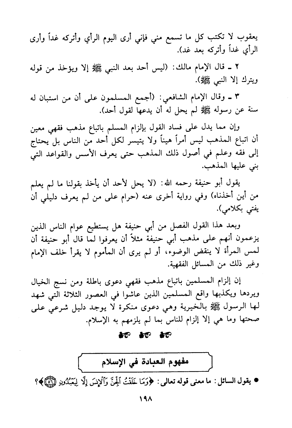 وبعد هذا القول الفصل من أبي حنيفة هل يستطيع عوام الناس الذين يزعمون أنهم على مذهب أبي حنيفة مثلاً أن يعرفوا لِمَ قال أبو حنيفة أن لمس المرأة لا ينقض الوضوء أو لِمَ يرى أن المأموم لا يقرأ خلف الإمام وغير ذلك من المسائل الفقهية.
