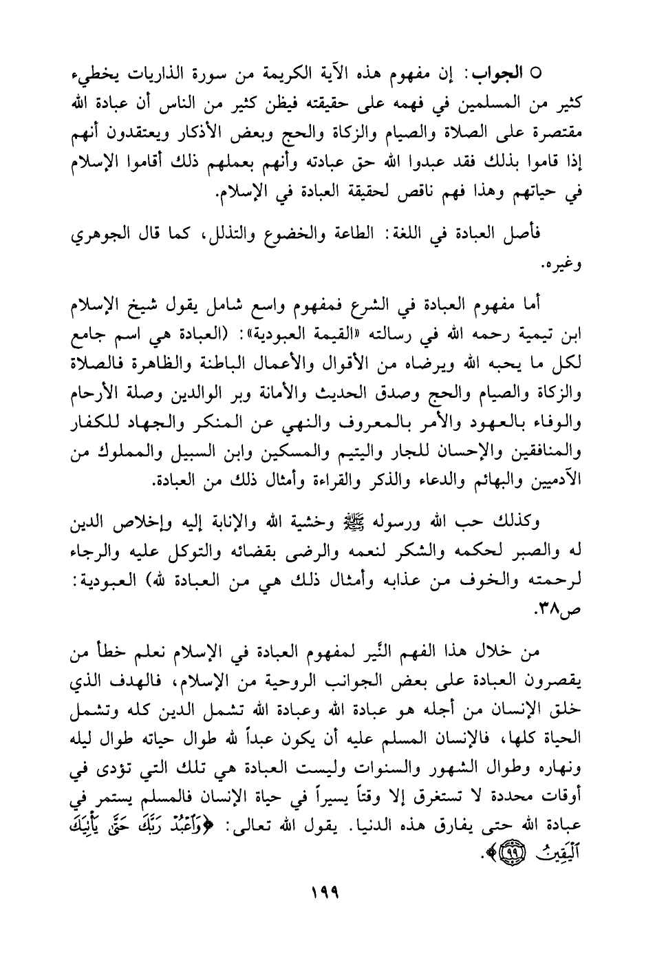 من خلال هذا الفهم النير لمفهوم العبادة في الإسلام نعلم خطأ من يقصرون العبادة على بعض الجوانب الروحية من الإسلام فالهدف الذي خلق الإنسان من أجله هو عبادة الله وعبادة الله تشمل الدين كله وتشمل الحياة كلها، فالإنسان المسلم عليه أن يكون عبداً لله طوال حياته طوال ليله ونهاره وطوال الشهور والسنوات وليست العبادة هي تلك التي تؤدى في أوقات محددة لا تستغرق إلا وقتاً يسيراً في حياة الإنسان فالمسلم يستمر في عبادة الله حتى يفارق هذه الدنيا. يقول الله تعالى: (وَاعْبُدْ رَبَّكَ حَتَّى يَأْتِيَكَ الْيَقِينُ).