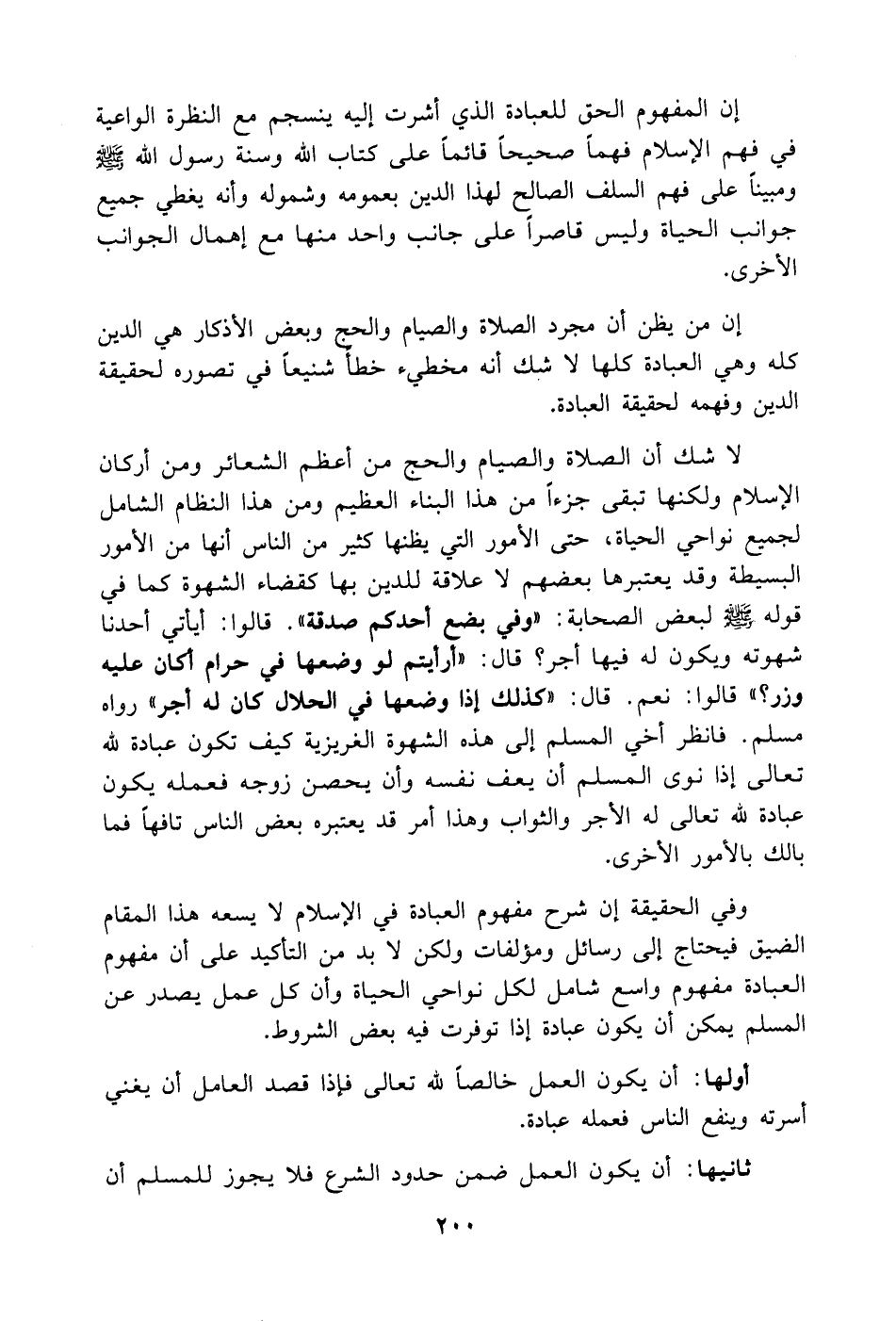 لا شك أن الصلاة والصيام والحج من أعظم الشعائر ومن أركان الإسلام ولكنها تبقى جزءاً من هذا البناء العظيم ومن هذا النظام الشامل لجميع نواحي الحياة، حتى الأمور التي يظنها كثير من الناس أنها من الأمور البسيطة وقد يعتبرها بعضهم لا علاقة للدين بها كقضاء الشهوة كما في قوله صلى الله عليه وسلم لبعض الصحابة: (وفي بضع أحدكم صدقة. قالوا: أيأتي أحدنا شهوته ويكون له فيها أجر؟ قال: أرأيتم لو وضعها في حرام أكان عليه وزر. قالوا: نعم. قال: كذلك إذا وضعها في الحلال كان له أجر) رواه مسلم. فانظر أخي المسلم إلى هذه الشهوة الغريزية كيف تكون عبادة لله تعالى إذا نوى المسلم أن يعف نفسه وأن يحصن زوجه فعمله يكون عبادة لله تعالى له الأجر والثواب وهذا الأمر قد يعتبره بعض الناس تافهاً فما بالك بالأمور الأخرى؟