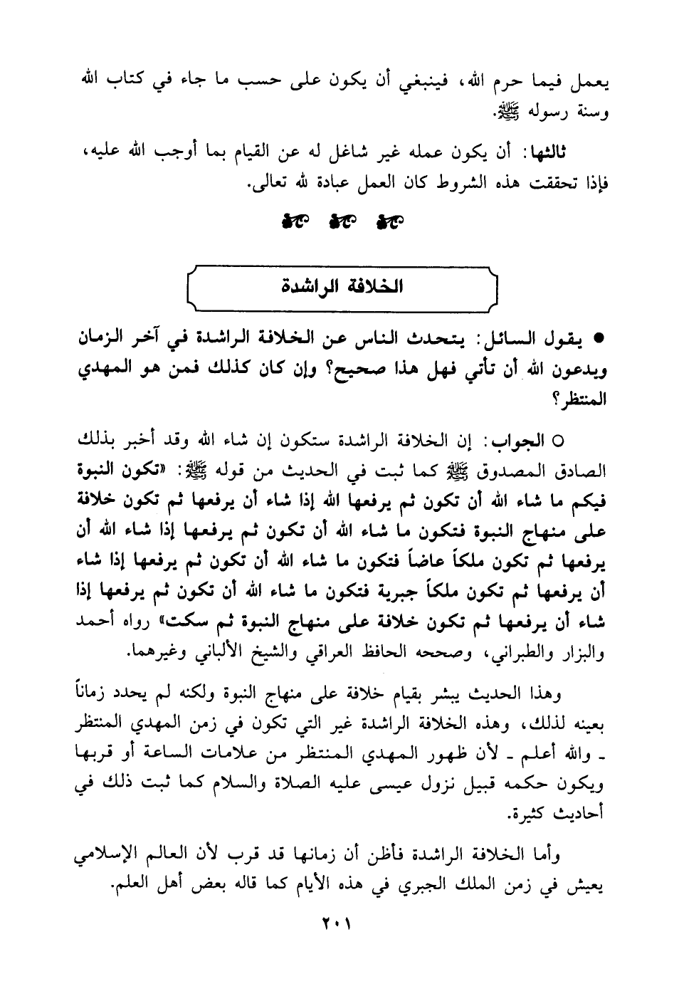 وأما الخلافة الراشدة فأظن أن زمانها قد قرب لأن العالم الإسلامي يعيش في زمن الملك الجبري في هذه الأيام كما قاله بعض أهل العلم.