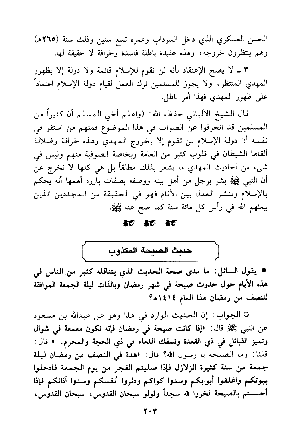 قال الشيخ الألباني حفظه الله: واعلم أخي المسلم أن كثيراً من المسلمين قد انحرفوا عن الصواب في هذا الموضوع فمنهم من استقر في نفسه أن دولة الإسلام لن تقوم إلا بخروج المهدي وهذه خرافة وضلال ألقاها الشيطان في قلوب كثير من العامة وبخاصة الصوفية منهم وليس في شيء من أحاديث المهدي ما يشعر بذلك مطلقاً بل هي كلها لا تخرج عن أن النبي صلى الله عليه وسلم بشر برجل من أهل بيته ووصفه بصفات بارزة من أهمها أنه يحكم بالإسلام وينشر العدل بين الأنام فهو في الحقيقة من المجددين الذين يبعثهم الله في رأس كل مائة سنة كما صح عنه صلى الله عليه وسلم.