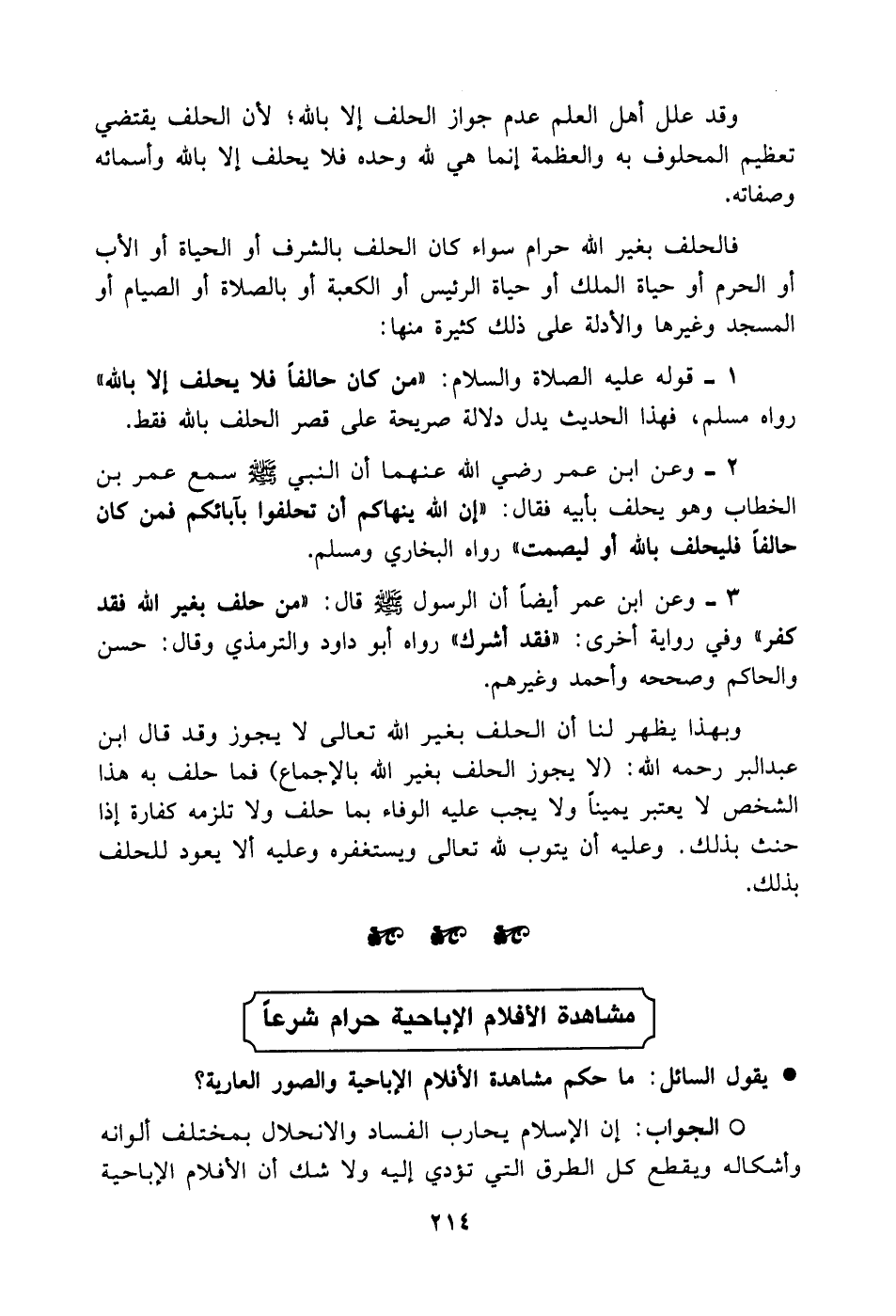 3. وعن ابن عمر أيضاً أن الرسول صلى الله عليه وسلم قال: (من حلف بغير الله فقد كفر) وفي روايةٍ أخرى (فقد أشرك) رواه أبو داود والترمذي وقال حسن، والحاكم وصححه، وأحمد وغيرهم.