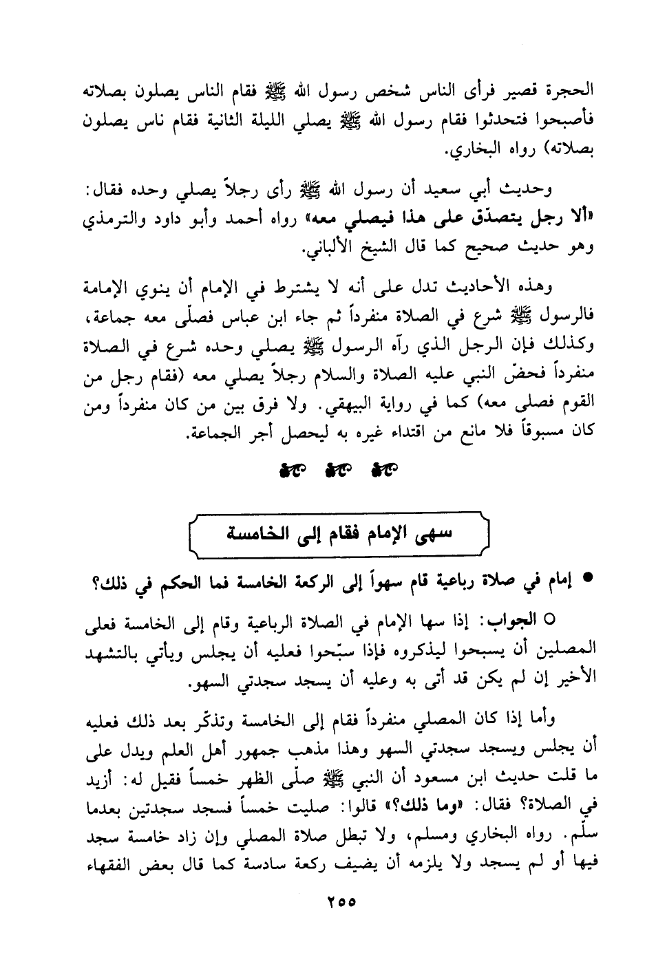 وأما إذا كان المصلي منفرداً فقام إلى الخامسة وتذكّر بعد ذلك فعليه أن يجلس ويسجد سجدتي السهو وهذا مذهب جمهور أهل العلم ويدل على ما قلت حديث ابن مسعود أن النبي صلى الله عليه وسلم صلى الظهر خمساً فقيل له: (أزيد في الصلاة؟ فقال: وما ذلك؟ قالوا: صليت خمساً فسجد سجدتين بعدما سلّم) رواه البخاري ومسلم ولا تبطل صلاة المصلي وإن زاد خامسة سجد فيها أو لم يسجد ولا يلزمه أن يضيف ركعة سادسة كما قال بعض الفقهاء