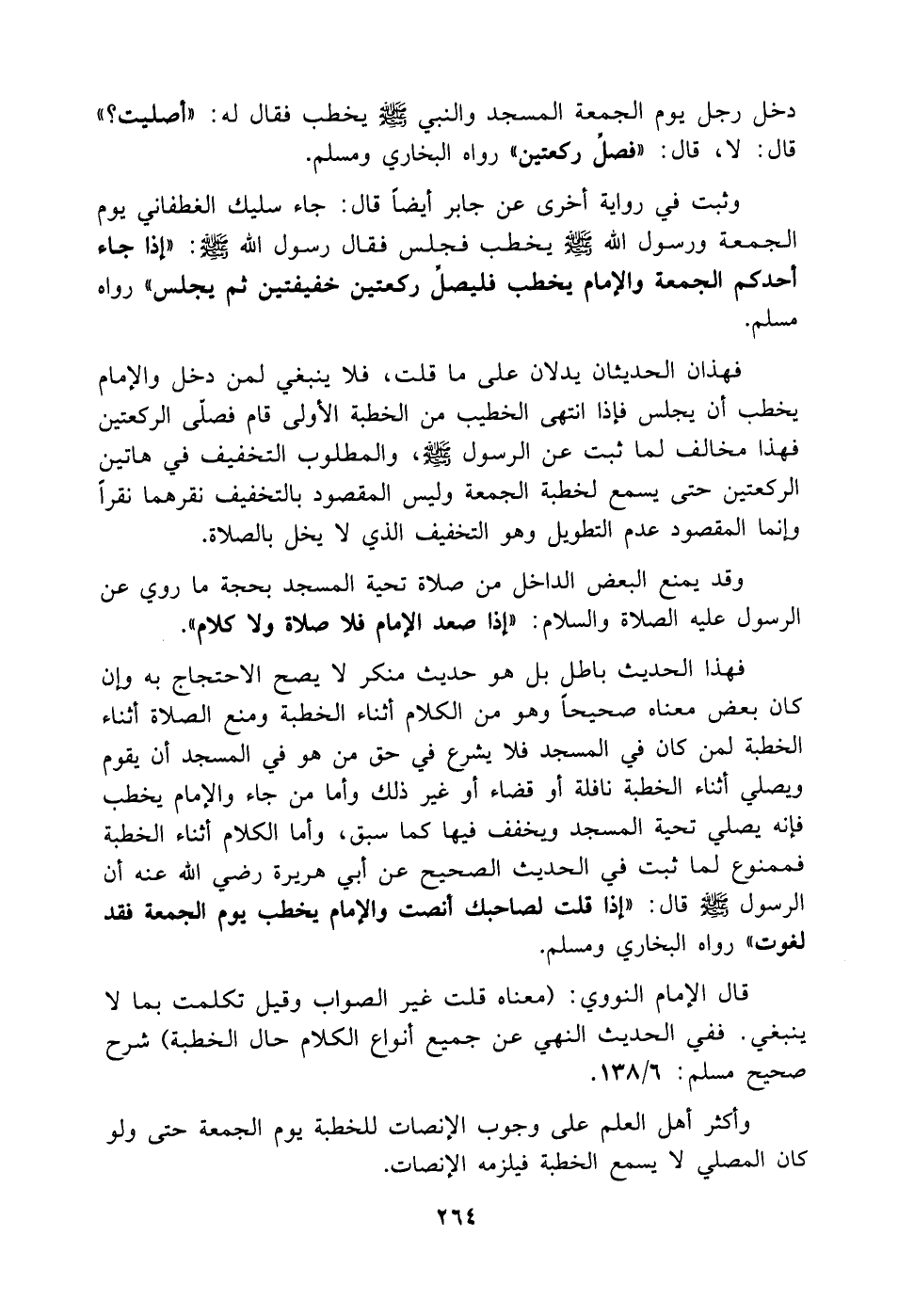 وقد يمنع البعض الداخل من صلاة تحية المسجد بحجة ما روي عن الرسول عليه الصلاة والسلام: (إذا صعد الإمام فلا صلاة ولا كلام) فهذا الحديث باطل بل هو منكر لا يصح الاحتجاج به وإن كان بعض معناه صحيحاً وهو منع الكلام أثناء الخطبة ومنع الصلاة أثناء الخطبة نافلة أو قضاء أو غير ذلك وأما من جاء والإمام يخطب فإنه يصلي تحية المسجد ويخفف فيها كما سبق وأما الكلام أثناء الخطبة فممنوع لما ثبت في الحديث الصحيح عن أبي هريرة رضي الله عنه أن الرسول صلى الله عليه وسلم قال: (إذا قلت لصاحبك أنصت والإمام يخطب يوم الجمعة فقد لغوت) رواه البخاري ومسلم.