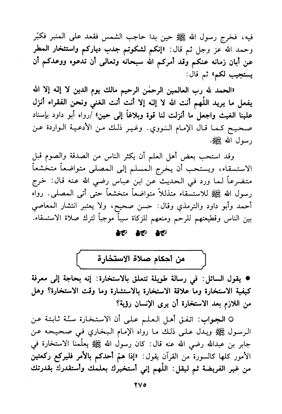 الجواب: اتفق أهل العلم على أن الاستخارة سنة ثابتة عن الرسول صلى الله عليه وسلم ويدل على ذلك ما رواه الإمام البخاري في صحيحه عن جابر بن عبد الله رضي الله عنه قال: (كان رسول الله صلى الله عليه وسلم يعلمنا الاستخارة في الأمور كلها كالسورة من القرآن يقول: إذا هم أحدكم بالأمر فليركع ركعتين من غير الفريضة ثم ليقل: اللهم إني استخيرك بعلمك واستقدرك بقدرتك