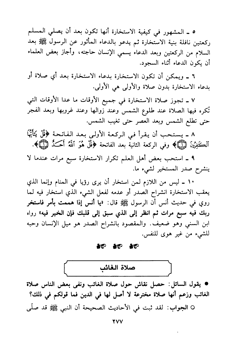 10. ليس من اللازم لمن استخار أن يرى رؤيا في المنام وإنما الذي يعقب الاستخارة انشراح الصدر أو عدمه لفعل الشيء الذي استخار فيه لما روي في حديث أنس أن الرسول صلى الله عليه وسلم قال: (يا أنس إذا هممت بأمر فاستخر ربك فيه سبع مرات ثم انظر إلى الذي سبق إلى قلبك فإن الخير فيه) رواه ابن السني وهو ضعيف. والمقصود بانشراح الصدر هو ميل الإنسان وحبه للشيء من غير هوى للنفس.