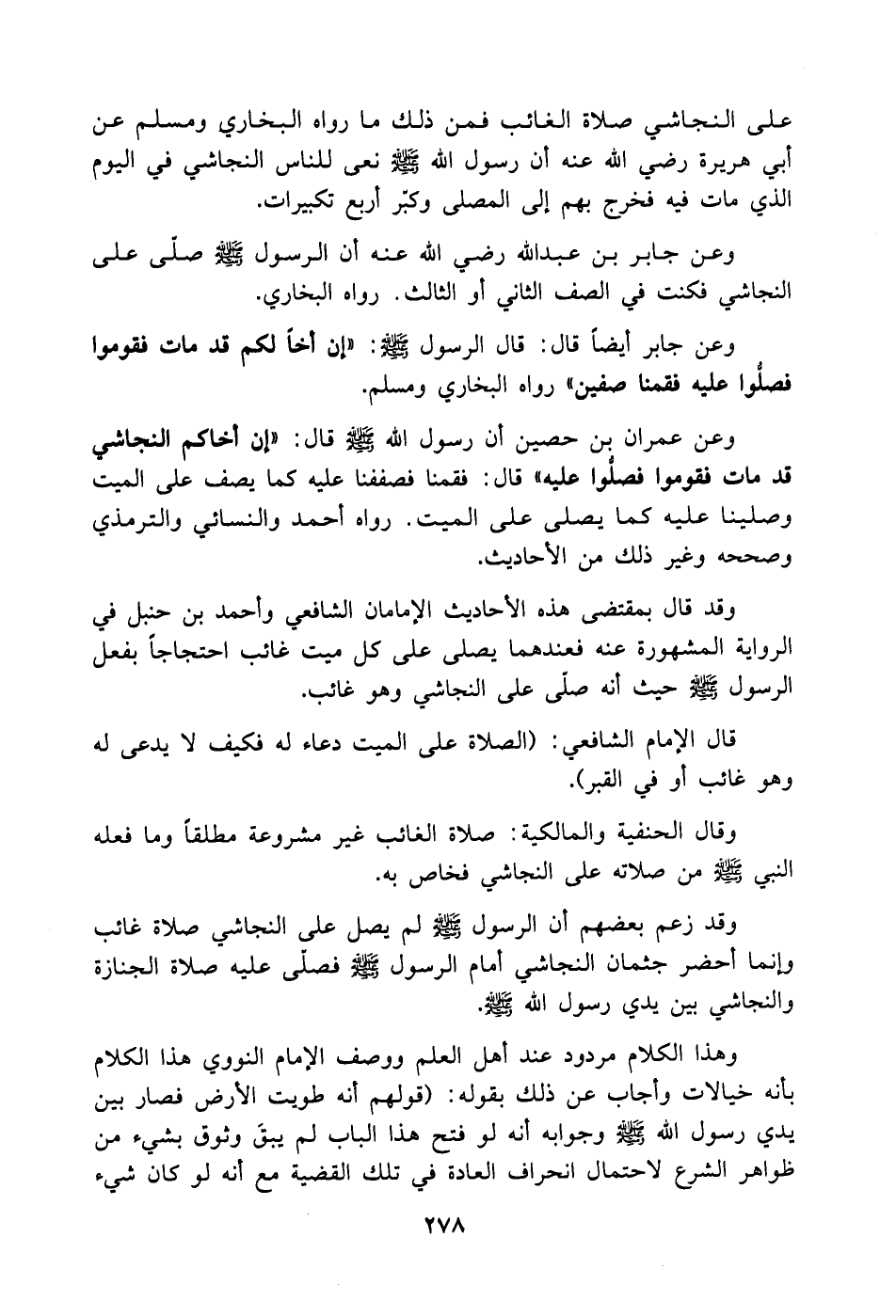 وعن جابر بن عبد الله رضي الله عنه: (أن الرسول صلى الله عليه وسلم صلى على النجاشي فكنت في الصف الثاني أو الثالث) رواه البخاري.